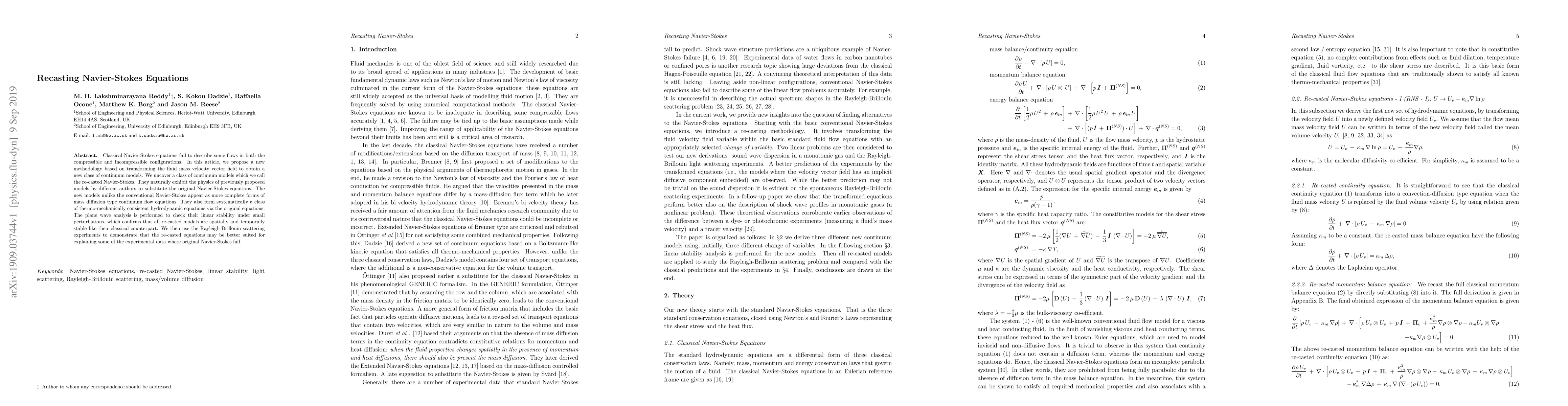 Classical Navier-Stokes equations fail to describe some flows in both the compressible and incompressible configurations. In this article, we propose a new methodology based on transforming the fluid mass velocity vector field to obtain a new class of continuum models. We uncover a class of continuum models which we call the re-casted Navier-Stokes. They naturally exhibit the physics of previously proposed models by different authors to substitute the original Navier-Stokes equations. The new models unlike the conventional Navier-Stokes appear as more complete forms of mass diffusion type continuum flow equations. They also form systematically a class of thermo-mechanically consistent hydrodynamic equations via the original equations. The plane wave analysis is performed to check their linear stability under small perturbations, which confirms that all re-casted models are spatially and temporally stable like their classical counterpart. We then use the Rayleigh-Brillouin scattering experiments to demonstrate that the re-casted equations may be better suited for explaining some of the experimental data where original Navier-Stokes fail.