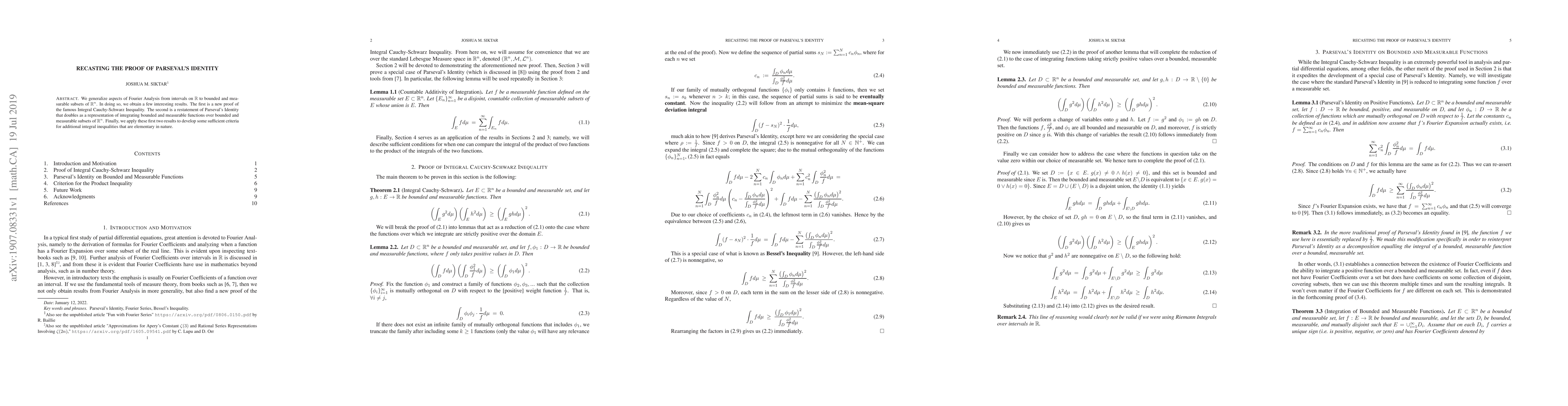 We generalize aspects of Fourier Analysis from intervals on $\mathbb{R}$ to bounded and measurable subsets of $\mathbb{R}^n$. In doing so, we obtain a few interesting results. The first is a new proof of the famous Integral Cauchy-Schwarz Inequality. The second is a restatement of Parseval's Identity that doubles as a representation of integrating bounded and measurable functions over bounded and measurable subsets of $\mathbb{R}^n$. Finally, we apply these first two results to develop some sufficient criteria for additional integral inequalities that are elementary in nature.