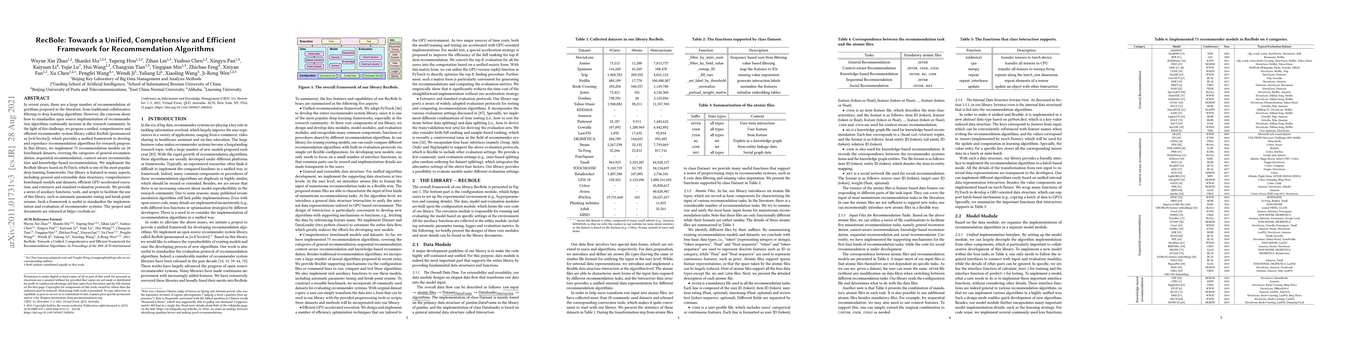 The RecBole library aims to standardize open-source recommendation algorithms by providing a unified framework for developing and reproducing various recommender systems. It implements 73 models across 28 datasets and offers extensive tools for efficient and GPU-accelerated execution.