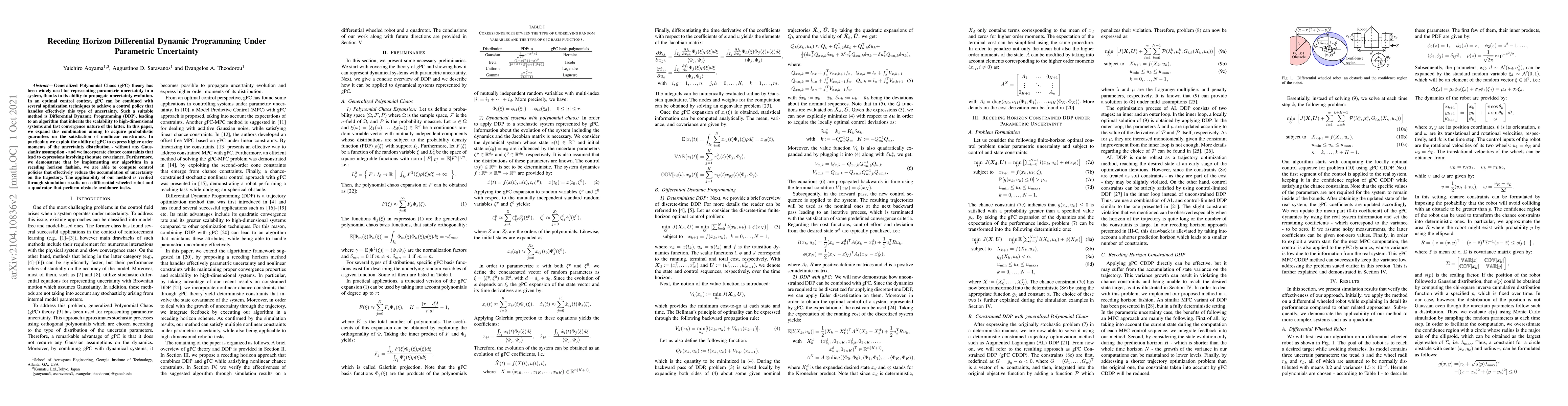 Generalized Polynomial Chaos (gPC) theory has been widely used for representing parametric uncertainty in a system, thanks to its ability to propagate uncertainty evolution. In an optimal control context, gPC can be combined with several optimization techniques to achieve a control policy that handles effectively this type of uncertainty. Such a suitable method is Differential Dynamic Programming (DDP), leading to an algorithm that inherits the scalability to high-dimensional systems and fast convergence nature of the latter. In this paper, we expand this combination aiming to acquire probabilistic guarantees on the satisfaction of nonlinear constraints. In particular, we exploit the ability of gPC to express higher order moments of the uncertainty distribution - without any Gaussianity assumption - and we incorporate chance constraints that lead to expressions involving the state covariance. Furthermore, we demonstrate that by implementing our algorithm in a receding horizon fashion, we are able to compute control policies that effectively reduce the accumulation of uncertainty on the trajectory. The applicability of our method is verified through simulation results on a differential wheeled robot and a quadrotor that perform obstacle avoidance tasks.