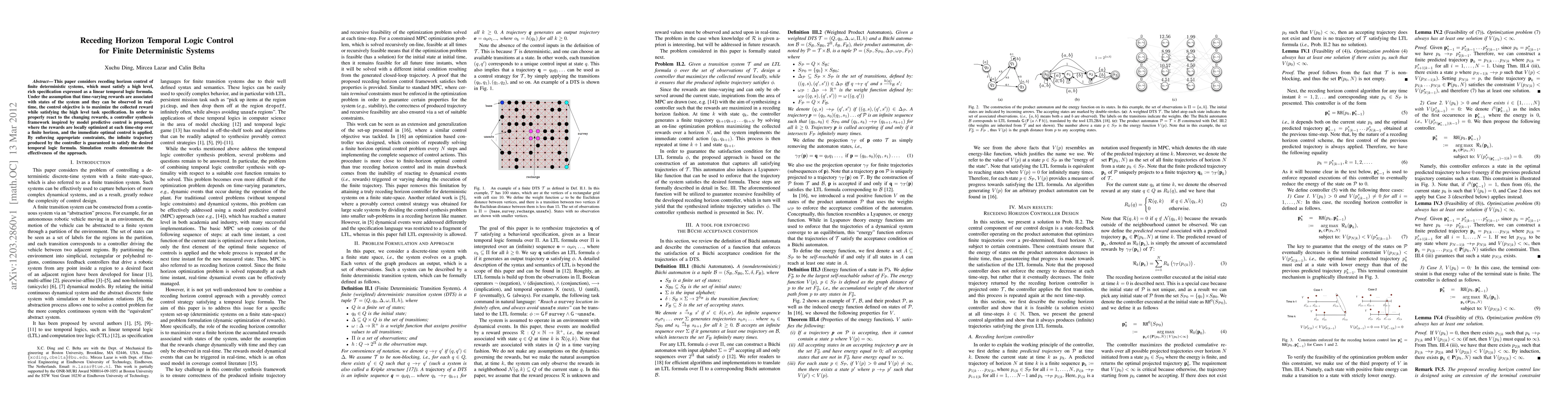 This paper considers receding horizon control of finite deterministic systems, which must satisfy a high level, rich specification expressed as a linear temporal logic formula. Under the assumption that time-varying rewards are associated with states of the system and they can be observed in real-time, the control objective is to maximize the collected reward while satisfying the high level task specification. In order to properly react to the changing rewards, a controller synthesis framework inspired by model predictive control is proposed, where the rewards are locally optimized at each time-step over a finite horizon, and the immediate optimal control is applied. By enforcing appropriate constraints, the infinite trajectory produced by the controller is guaranteed to satisfy the desired temporal logic formula. Simulation results demonstrate the effectiveness of the approach.