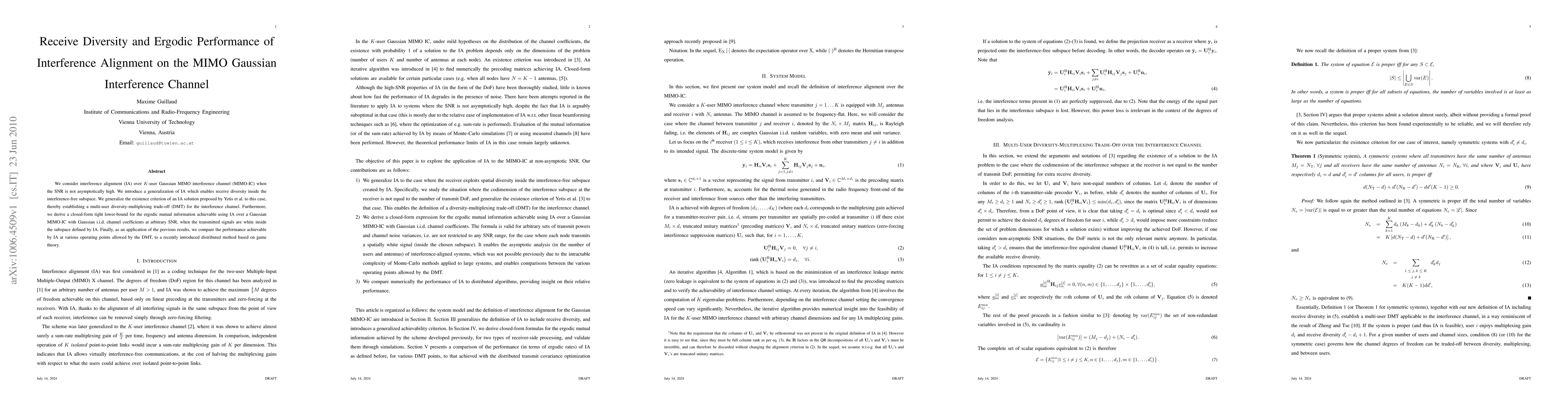 This paper explores interference alignment (IA) in K-user Gaussian MIMO channels at non-asymptotically high SNR, introducing a generalized IA that supports receive diversity. It establishes a multi-user diversity-multiplexing trade-off and derives a tight lower-bound for ergodic mutual information, comparing IA performance to a game-theoretic distributed method.