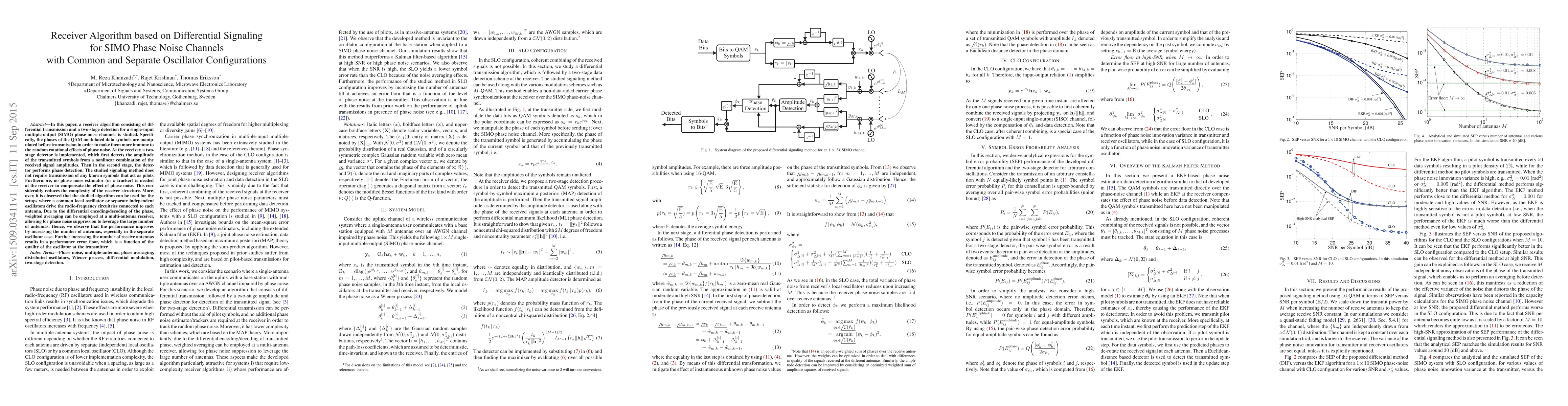 In this paper, a receiver algorithm consisting of differential transmission and a two-stage detection for a single-input multiple-output (SIMO) phase-noise channels is studied. Specifically, the phases of the QAM modulated data symbols are manipulated before transmission in order to make them more immune to the random rotational effects of phase noise. At the receiver, a two-stage detector is implemented, which first detects the amplitude of the transmitted symbols from a nonlinear combination of the received signal amplitudes. Then in the second stage, the detector performs phase detection. The studied signaling method does not require transmission of any known symbols that act as pilots. Furthermore, no phase noise estimator (or a tracker) is needed at the receiver to compensate the effect of phase noise. This considerably reduces the complexity of the receiver structure. Moreover, it is observed that the studied algorithm can be used for the setups where a common local oscillator or separate independent oscillators drive the radio-frequency circuitries connected to each antenna. Due to the differential encoding/decoding of the phase, weighted averaging can be employed at a multi-antenna receiver, allowing for phase noise suppression to leverage the large number of antennas. Hence, we observe that the performance improves by increasing the number of antennas, especially in the separate oscillator case. Further increasing the number of receive antennas results in a performance error floor, which is a function of the quality of the oscillator at the transmitter.