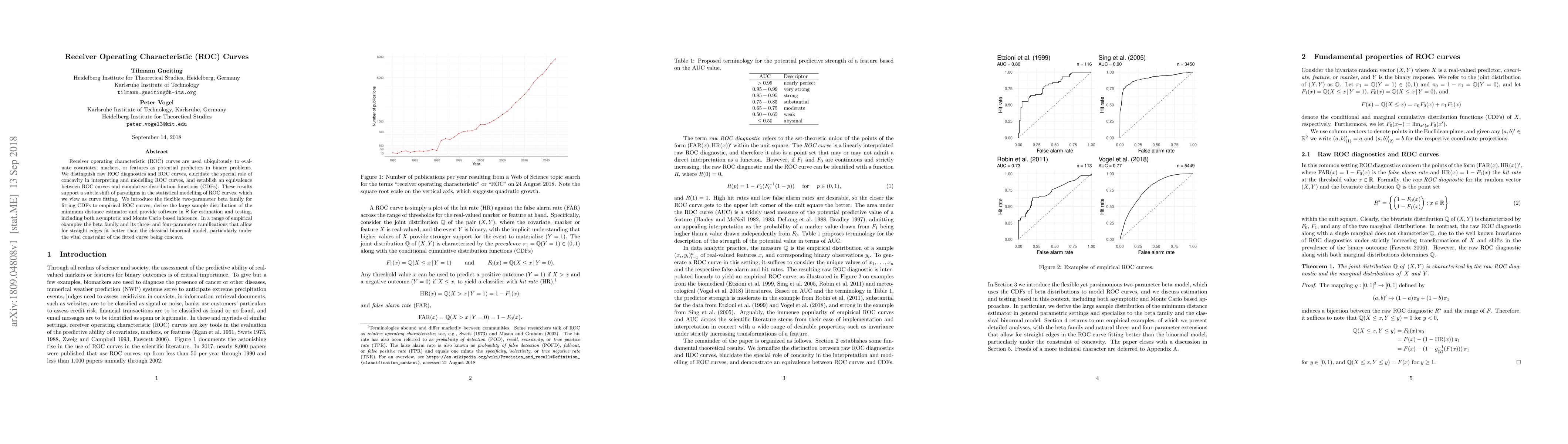Receiver operating characteristic (ROC) curves are used ubiquitously to evaluate covariates, markers, or features as potential predictors in binary problems. We distinguish raw ROC diagnostics and ROC curves, elucidate the special role of concavity in interpreting and modelling ROC curves, and establish an equivalence between ROC curves and cumulative distribution functions (CDFs). These results support a subtle shift of paradigms in the statistical modelling of ROC curves, which we view as curve fitting. We introduce the flexible two-parameter beta family for fitting CDFs to empirical ROC curves, derive the large sample distribution of the minimum distance estimator and provide software in R for estimation and testing, including both asymptotic and Monte Carlo based inference. In a range of empirical examples the beta family and its three- and four-parameter ramifications that allow for straight edges fit better than the classical binormal model, particularly under the vital constraint of the fitted curve being concave.