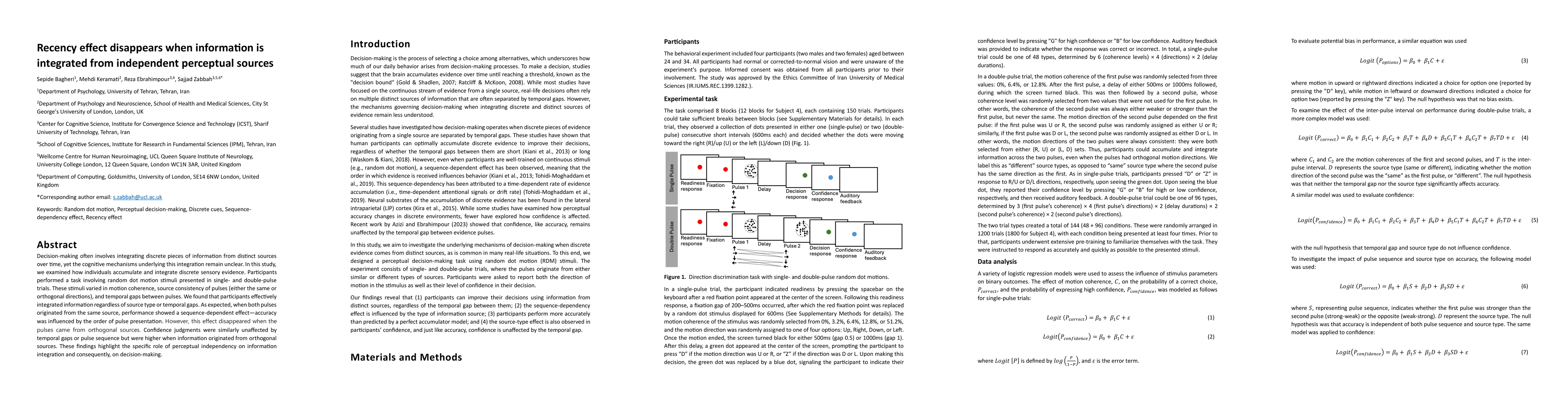 Decision-making often involves integrating discrete pieces of information from distinct sources over time, yet the cognitive mechanisms underlying this integration remain unclear. In this study, we examined how individuals accumulate and integrate discrete sensory evidence. Participants performed a task involving random dot motion stimuli presented in single- and double-pulse trials. These stimuli varied in motion coherence, source consistency of pulses (either the same or orthogonal directions), and temporal gaps between pulses. We found that participants effectively integrated information regardless of source type or temporal gaps. As expected, when both pulses originated from the same source, performance showed a sequence-dependent effect-accuracy was influenced by the order of pulse presentation. However, this effect disappeared when the pulses came from orthogonal sources. Confidence judgments were similarly unaffected by temporal gaps or pulse sequence but were higher when information originated from orthogonal sources. These findings highlight the specific role of perceptual independency on information integration and consequently, on decision-making.