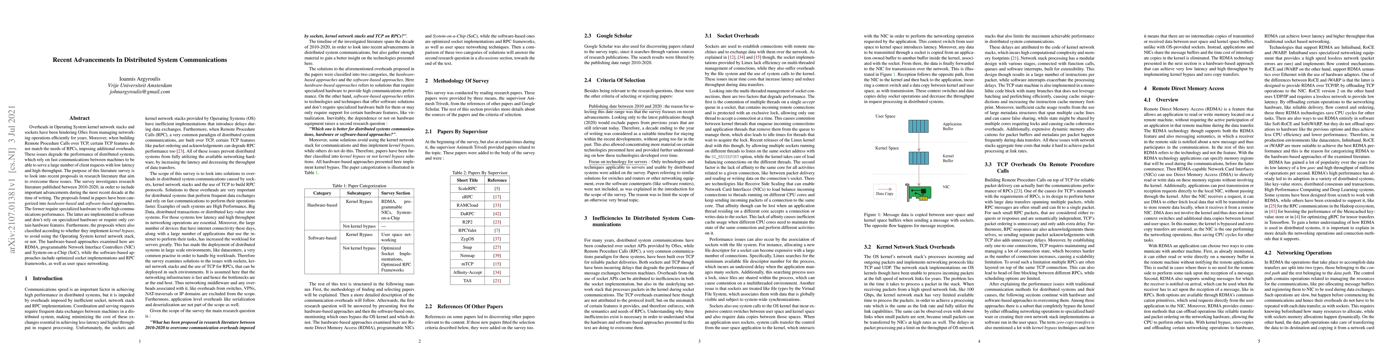 Overheads in Operating System kernel network stacks and sockets have been hindering OSes from managing networking operations efficiently for years. Moreover, when building Remote Procedure Calls over TCP, certain TCP features do not match the needs of RPCs, imposing additional overheads. These issues degrade the performance of distributed systems, which rely on fast communications between machines to be able to serve a large number of client requests with low latency and high throughput. The purpose of this literature survey is to look into recent proposals in research literature that aim to overcome these issues. The survey investigates research literature published between 2010-2020, in order to include important advancements during the most recent decade at the time of writing. The proposals found in papers have been categorized into hardware-based and software-based approaches. The former require specialized hardware to offer high communications performance. The latter are implemented in software and don't rely on specialized hardware or require only certain hardware features. Furthermore, the proposals where also classified according to whether they implement kernel bypass, to avoid using the Operating System kernel network stack, or not. The hardware-based approaches examined here are RDMA, programmable Network Interface Controllers (NIC) and System-on-a-Chip (SoC), while the software-based approaches include optimized socket implementations and RPC frameworks, as well as user space networking.