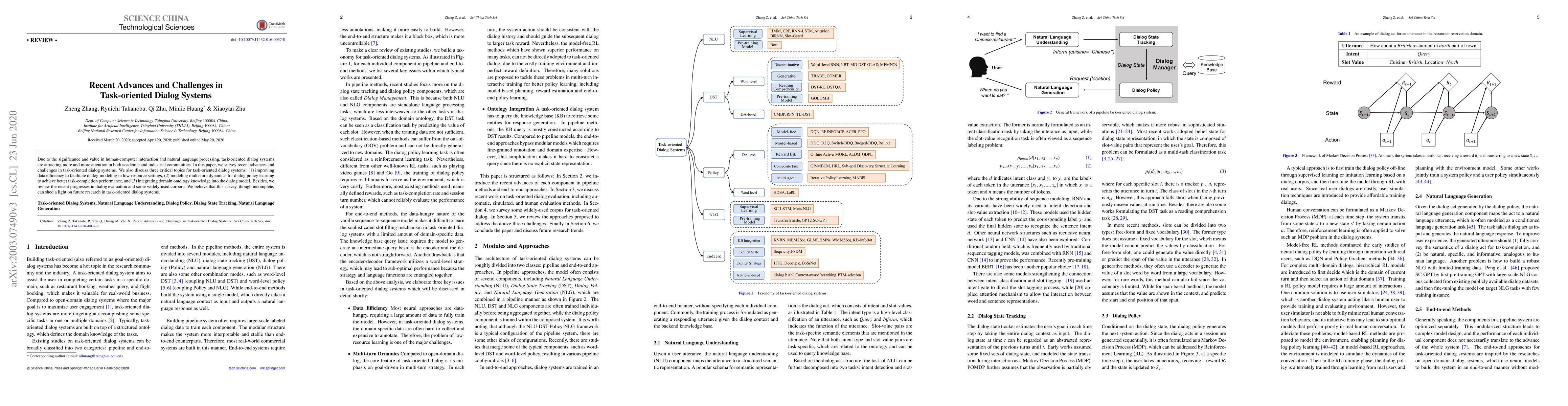 This paper surveys recent advances and challenges in task-oriented dialog systems, focusing on improving data efficiency, modeling multi-turn dynamics, and integrating domain ontology knowledge. It also reviews recent progress in dialog evaluation and widely-used corpora, aiming to guide future research directions.