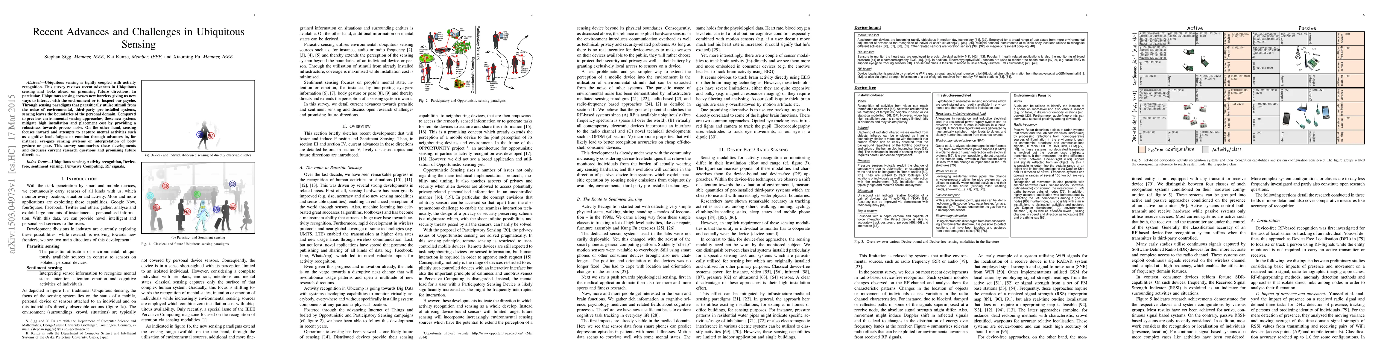 Ubiquitous sensing is tightly coupled with activity recognition. This survey reviews recent advances in Ubiquitous sensing and looks ahead on promising future directions. In particular, Ubiquitous sensing crosses new barriers giving us new ways to interact with the environment or to inspect our psyche. Through sensing paradigms that parasitically utilise stimuli from the noise of environmental, third-party pre-installed systems, sensing leaves the boundaries of the personal domain. Compared to previous environmental sensing approaches, these new systems mitigate high installation and placement cost by providing a robustness towards process noise. On the other hand, sensing focuses inward and attempts to capture mental activities such as cognitive load, fatigue or emotion through advances in, for instance, eye-gaze sensing systems or interpretation of body gesture or pose. This survey summarises these developments and discusses current research questions and promising future directions.
