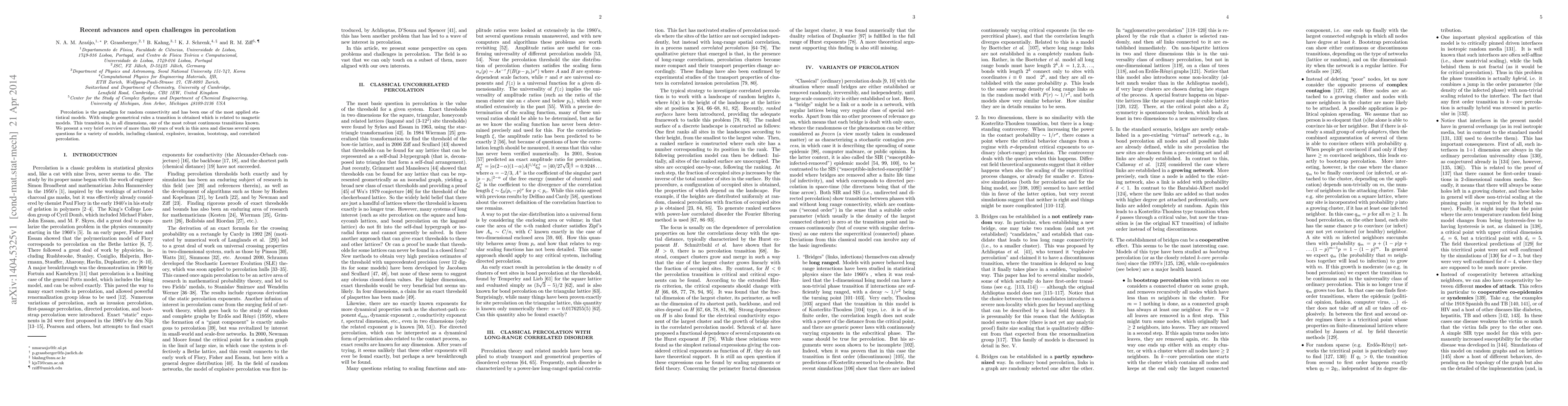Percolation is the paradigm for random connectivity and has been one of the most applied statistical models. With simple geometrical rules a transition is obtained which is related to magnetic models. This transition is, in all dimensions, one of the most robust continuous transitions known. We present a very brief overview of more than 60 years of work in this area and discuss several open questions for a variety of models, including classical, explosive, invasion, bootstrap, and correlated percolation.