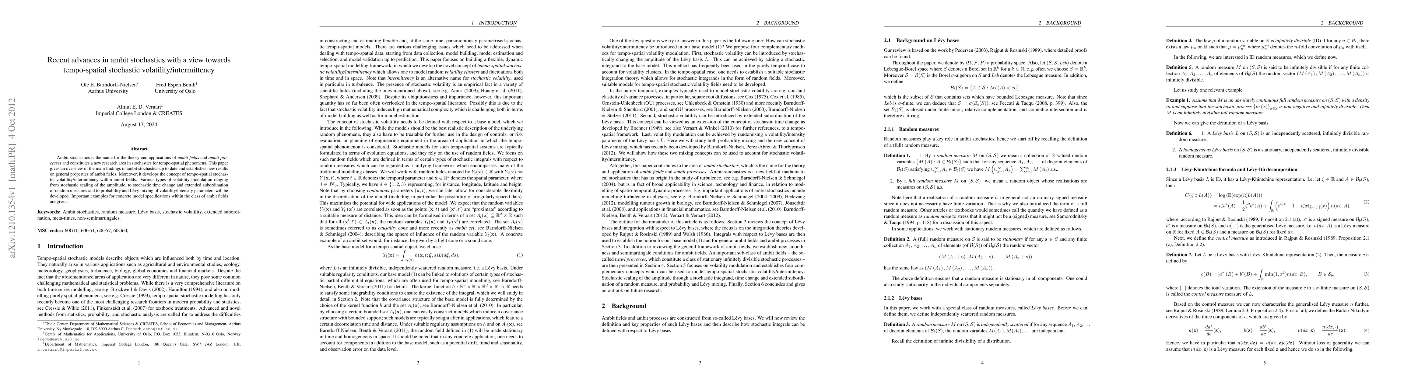 This paper reviews recent advances in ambit stochastics, a new area of research that studies tempo-spatial stochastic volatility/intermittency in fields and processes. It establishes new results on general properties of ambit fields and develops various types of volatility modulation.