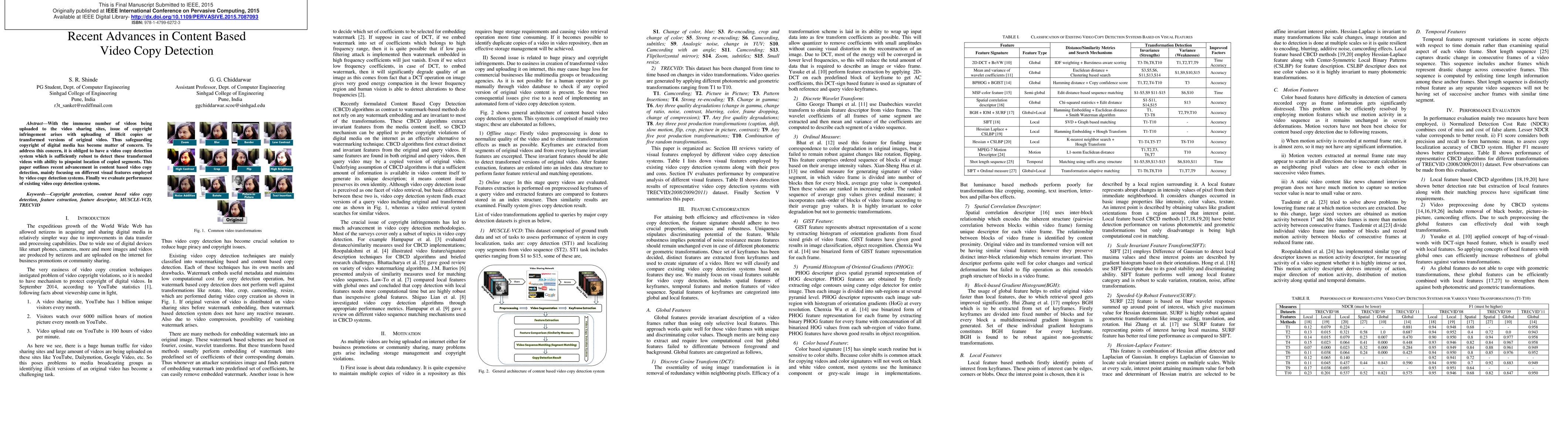With the immense number of videos being uploaded to the video sharing sites, issue of copyright infringement arises with uploading of illicit copies or transformed versions of original video. Thus safeguarding copyright of digital media has become matter of concern. To address this concern, it is obliged to have a video copy detection system which is sufficiently robust to detect these transformed videos with ability to pinpoint location of copied segments. This paper outlines recent advancement in content based video copy detection, mainly focusing on different visual features employed by video copy detection systems. Finally we evaluate performance of existing video copy detection systems.