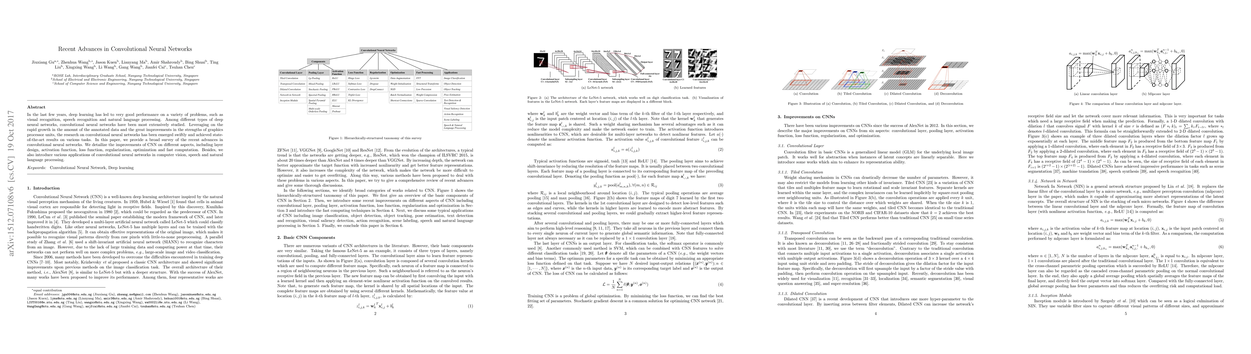 This paper surveys recent advancements in convolutional neural networks (CNNs), highlighting improvements in layer design, activation functions, loss functions, regularization, optimization, and computational speed. It also explores diverse applications of CNNs in computer vision, speech, and natural language processing.