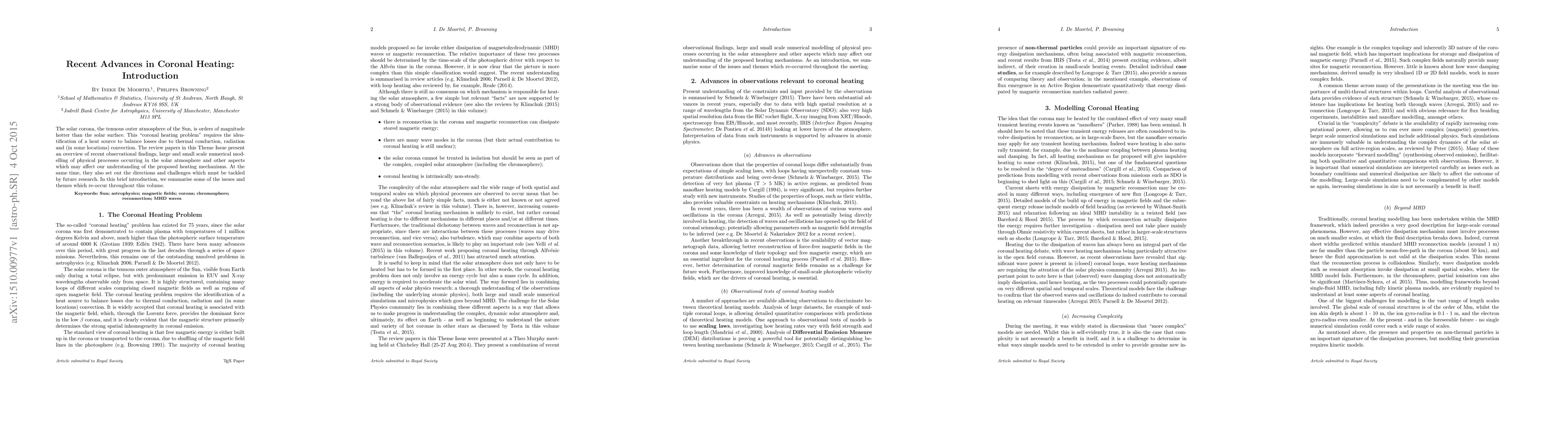 The solar corona, the tenuous outer atmosphere of the Sun, is orders of magnitude hotter than the solar surface. This 'coronal heating problem' requires the identification of a heat source to balance losses due to thermal conduction, radiation and (in some locations) convection. The review papers in this Theo Murphy meeting issue present an overview of recent observational findings, large- and small-scale numerical modelling of physical processes occurring in the solar atmosphere and other aspects which may affect our understanding of the proposed heating mechanisms. At the same time, they also set out the directions and challenges which must be tackled by future research. In this brief introduction, we summarize some of the issues and themes which reoccur throughout this issue.