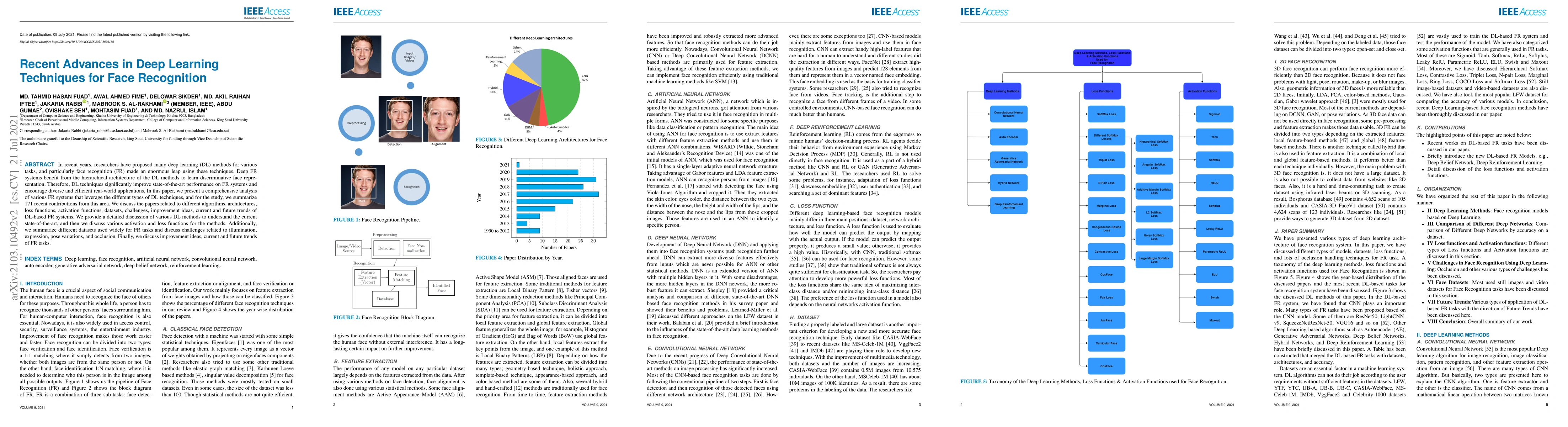 In recent years, researchers have proposed many deep learning (DL) methods for various tasks, and particularly face recognition (FR) made an enormous leap using these techniques. Deep FR systems benefit from the hierarchical architecture of the DL methods to learn discriminative face representation. Therefore, DL techniques significantly improve state-of-the-art performance on FR systems and encourage diverse and efficient real-world applications. In this paper, we present a comprehensive analysis of various FR systems that leverage the different types of DL techniques, and for the study, we summarize 168 recent contributions from this area. We discuss the papers related to different algorithms, architectures, loss functions, activation functions, datasets, challenges, improvement ideas, current and future trends of DL-based FR systems. We provide a detailed discussion of various DL methods to understand the current state-of-the-art, and then we discuss various activation and loss functions for the methods. Additionally, we summarize different datasets used widely for FR tasks and discuss challenges related to illumination, expression, pose variations, and occlusion. Finally, we discuss improvement ideas, current and future trends of FR tasks.