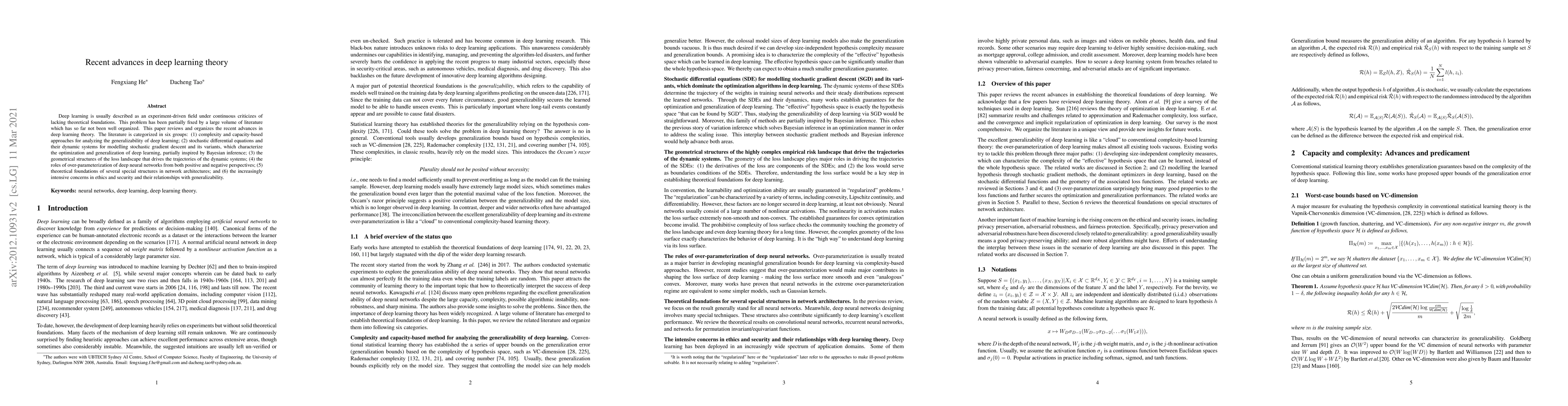 This paper organizes recent advances in deep learning theory into six categories: complexity and capacity analysis, stochastic differential equations for optimization, geometrical loss landscape, roles of over-parameterization, specialized network architecture foundations, and ethical/security concerns impacting generalizability.