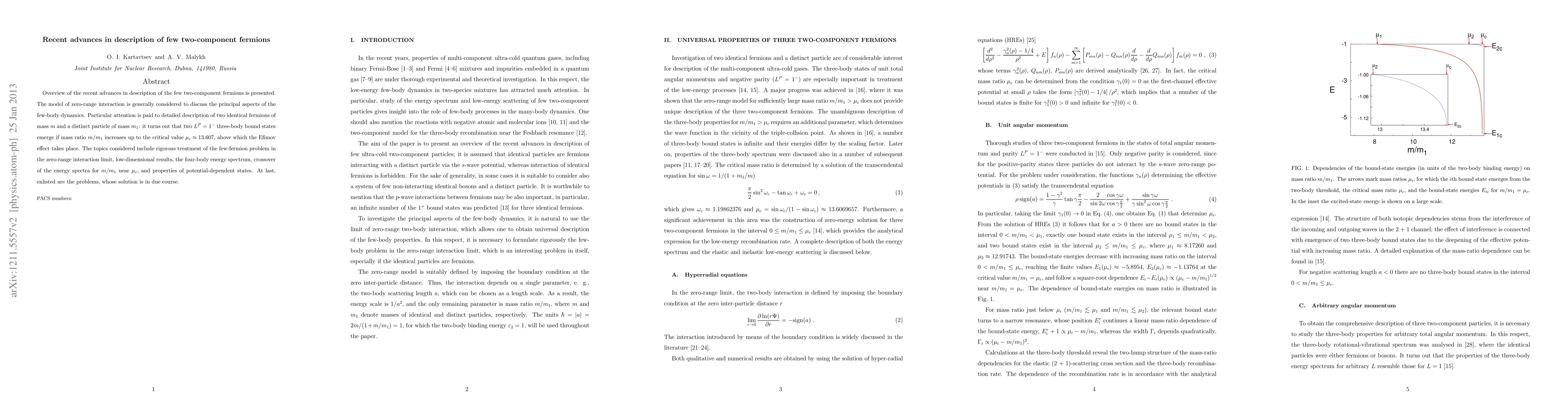 Overview of the recent advances in description of the few two-component fermions is presented. The model of zero-range interaction is generally considered to discuss the principal aspects of the few-body dynamics. Particular attention is paid to detailed description of two identical fermions of mass $m$ and a distinct particle of mass $m_1$: it turns out that two $L^P = 1^-$ three-body bound states emerge if mass ratio $m/m_1$ increases up to the critical value $\mu_c \approx 13.607$, above which the Efimov effect takes place. The topics considered include rigorous treatment of the few-fermion problem in the zero-range interaction limit, low-dimensional results, the four-body energy spectrum, crossover of the energy spectra for $m/m_1$ near $\mu_c $, and properties of potential-dependent states. At last, enlisted are the problems, whose solution is in due course.