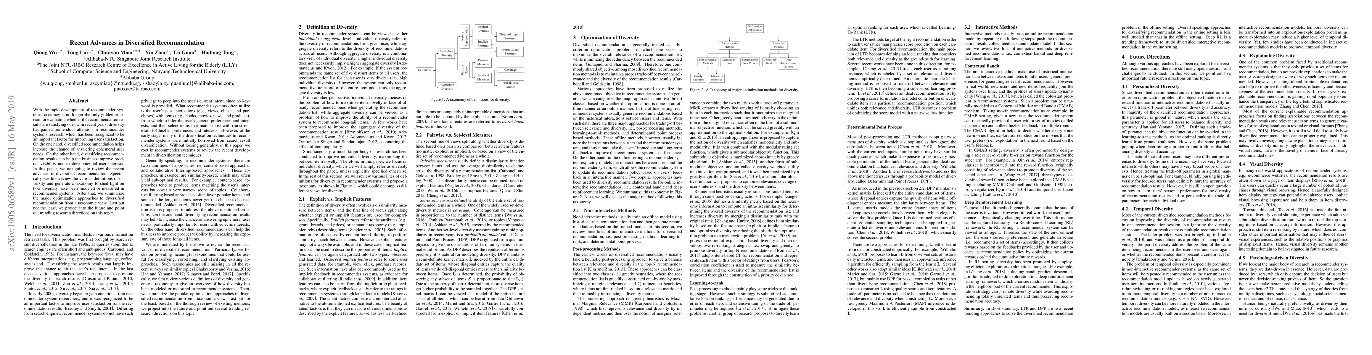 With the rapid development of recommender systems, accuracy is no longer the only golden criterion for evaluating whether the recommendation results are satisfying or not. In recent years, diversity has gained tremendous attention in recommender systems research, which has been recognized to be an important factor for improving user satisfaction. On the one hand, diversified recommendation helps increase the chance of answering ephemeral user needs. On the other hand, diversifying recommendation results can help the business improve product visibility and explore potential user interests. In this paper, we are going to review the recent advances in diversified recommendation. Specifically, we first review the various definitions of diversity and generate a taxonomy to shed light on how diversity have been modeled or measured in recommender systems. After that, we summarize the major optimization approaches to diversified recommendation from a taxonomic view. Last but not the least, we project into the future and point out trending research directions on this topic.