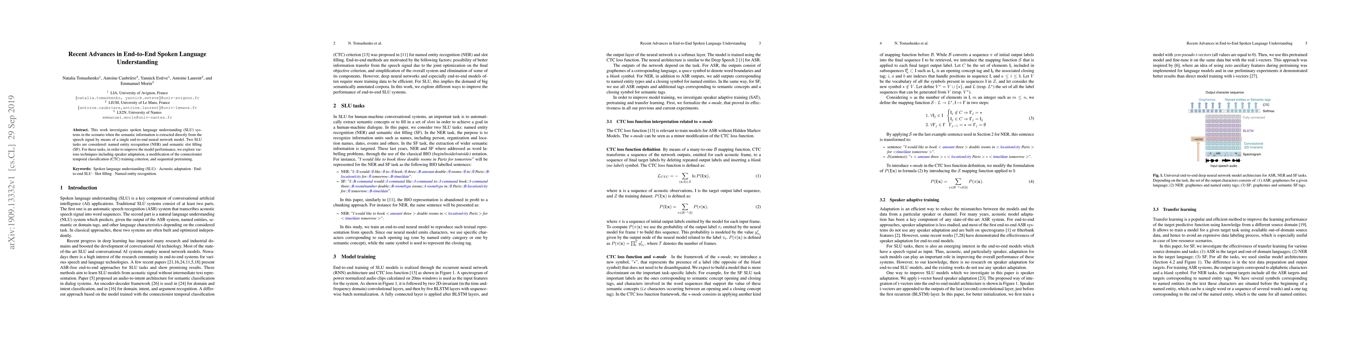 This paper explores end-to-end neural network models for spoken language understanding, focusing on named entity recognition and semantic slot filling, and investigates techniques like speaker adaptation and CTC modifications to enhance performance.