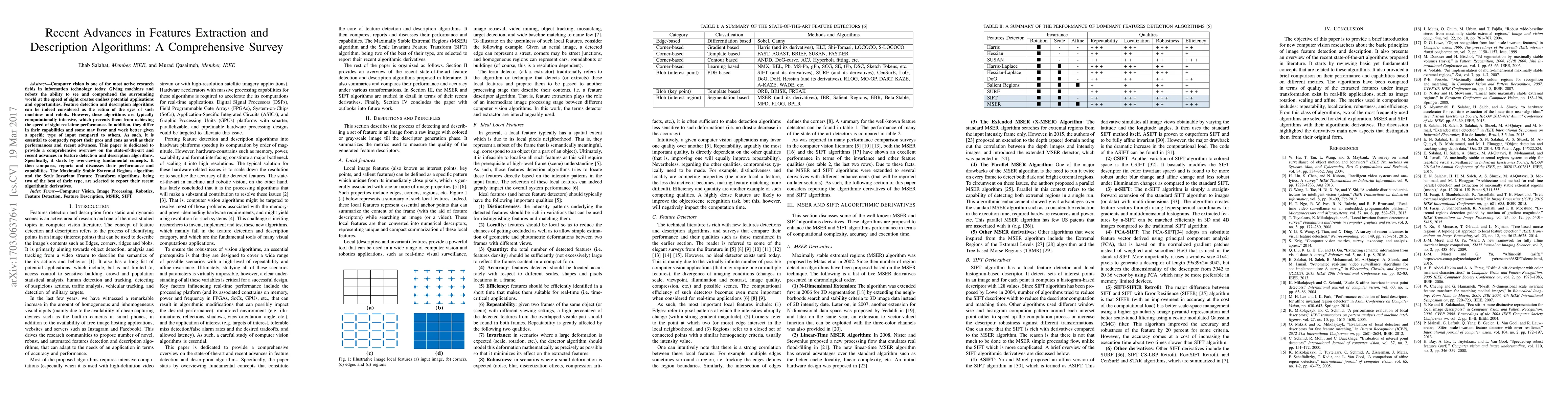 Computer vision is one of the most active research fields in information technology today. Giving machines and robots the ability to see and comprehend the surrounding world at the speed of sight creates endless potential applications and opportunities. Feature detection and description algorithms can be indeed considered as the retina of the eyes of such machines and robots. However, these algorithms are typically computationally intensive, which prevents them from achieving the speed of sight real-time performance. In addition, they differ in their capabilities and some may favor and work better given a specific type of input compared to others. As such, it is essential to compactly report their pros and cons as well as their performances and recent advances. This paper is dedicated to provide a comprehensive overview on the state-of-the-art and recent advances in feature detection and description algorithms. Specifically, it starts by overviewing fundamental concepts. It then compares, reports and discusses their performance and capabilities. The Maximally Stable Extremal Regions algorithm and the Scale Invariant Feature Transform algorithms, being two of the best of their type, are selected to report their recent algorithmic derivatives.