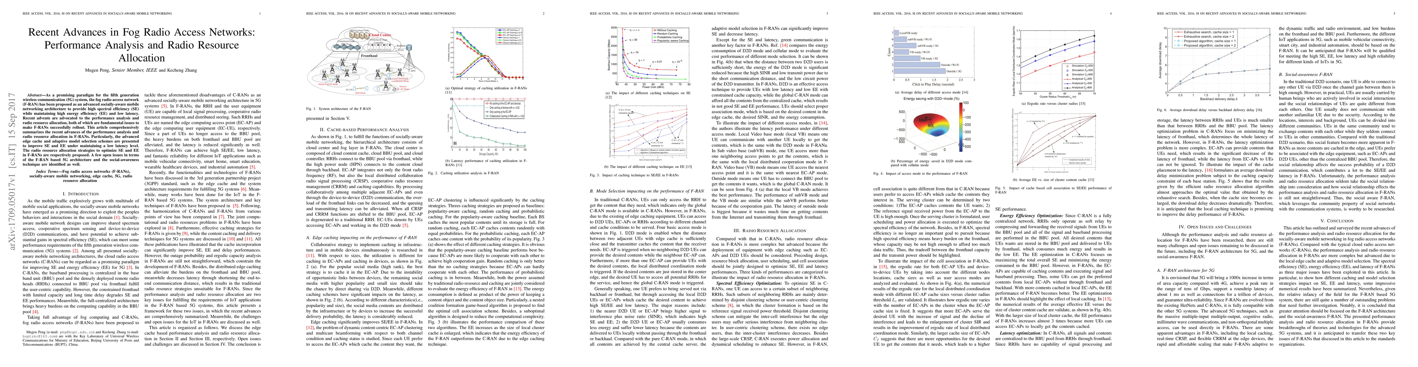 This paper reviews recent advancements in fog radio access networks (F-RANs) for 5G, focusing on performance analysis and radio resource allocation strategies. It highlights new edge cache and adaptive model selection methods to enhance spectral and energy efficiency while ensuring low latency, and proposes optimization strategies for resource allocation.