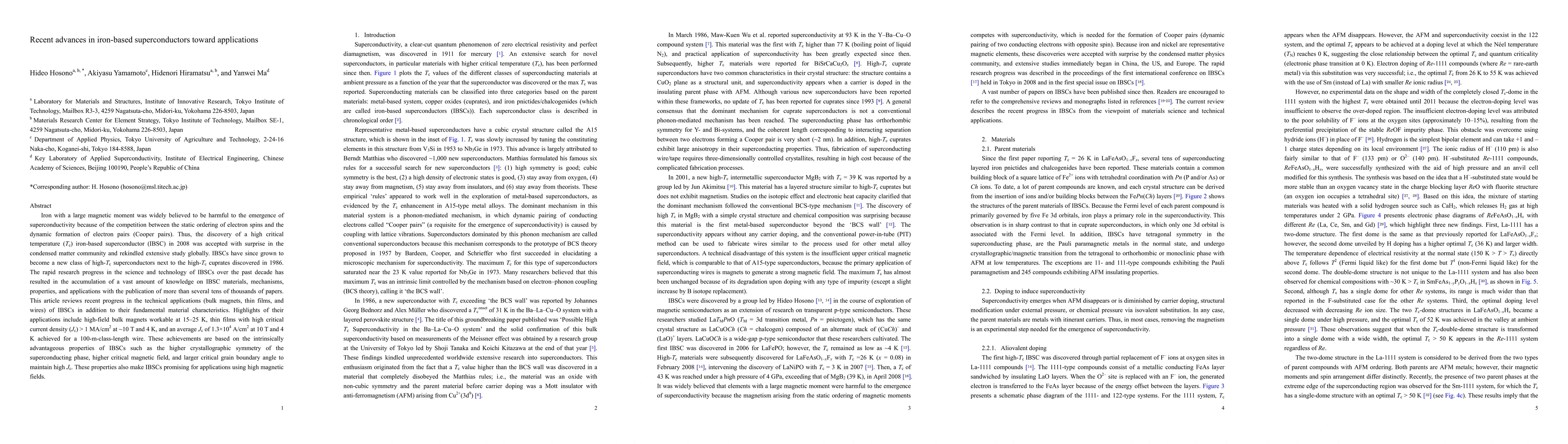 Iron with a large magnetic moment was widely believed to be harmful to the emergence of superconductivity because of the competition between the static ordering of electron spins and the dynamic formation of electron pairs (Cooper pairs). Thus, the discovery of a high critical temperature (Tc) iron-based superconductor (IBSC) in 2008 was accepted with surprise in the condensed matter community and rekindled extensive study globally. IBSCs have since grown to become a new class of high-Tc superconductors next to the high-Tc cuprates discovered in 1986. The rapid research progress in the science and technology of IBSCs over the past decade has resulted in the accumulation of a vast amount of knowledge on IBSC materials, mechanisms, properties, and applications with the publication of more than several tens of thousands of papers. This article reviews recent progress in the technical applications (bulk magnets, thin films, and wires) of IBSCs in addition to their fundamental material characteristics. Highlights of their applications include high-field bulk magnets workable at 15-25 K, thin films with high critical current density (Jc) > 1 MA/cm2 at ~10 T and 4 K, and an average Jc of 1.3*104 A/cm2 at 10 T and 4 K achieved for a 100-m-class-length wire. These achievements are based on the intrinsically advantageous properties of IBSCs such as the higher crystallographic symmetry of the superconducting phase, higher critical magnetic field, and larger critical grain boundary angle to maintain high Jc. These properties also make IBSCs promising for applications using high magnetic fields.