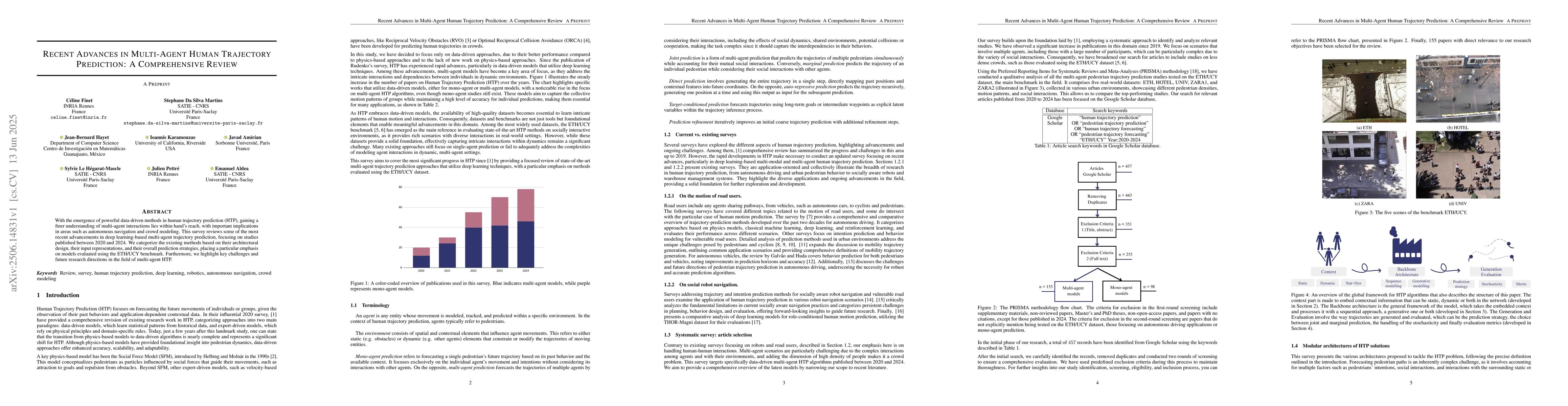 With the emergence of powerful data-driven methods in human trajectory prediction (HTP), gaining a finer understanding of multi-agent interactions lies within hand's reach, with important implications in areas such as autonomous navigation and crowd modeling. This survey reviews some of the most recent advancements in deep learning-based multi-agent trajectory prediction, focusing on studies published between 2020 and 2024. We categorize the existing methods based on their architectural design, their input representations, and their overall prediction strategies, placing a particular emphasis on models evaluated using the ETH/UCY benchmark. Furthermore, we highlight key challenges and future research directions in the field of multi-agent HTP.