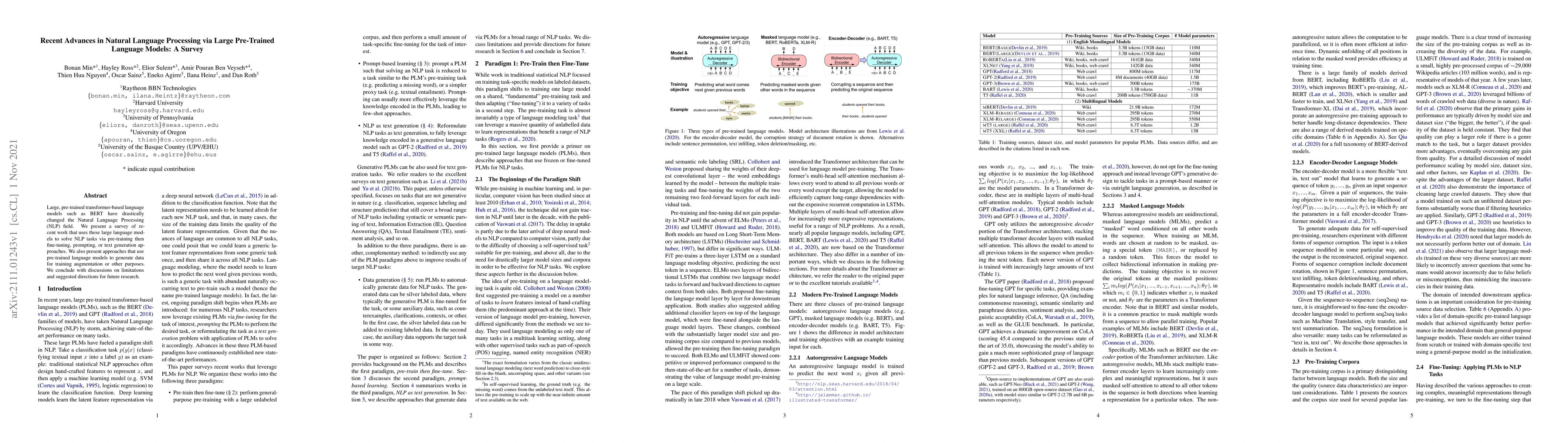 Large, pre-trained transformer-based language models such as BERT have drastically changed the Natural Language Processing (NLP) field. We present a survey of recent work that uses these large language models to solve NLP tasks via pre-training then fine-tuning, prompting, or text generation approaches. We also present approaches that use pre-trained language models to generate data for training augmentation or other purposes. We conclude with discussions on limitations and suggested directions for future research.