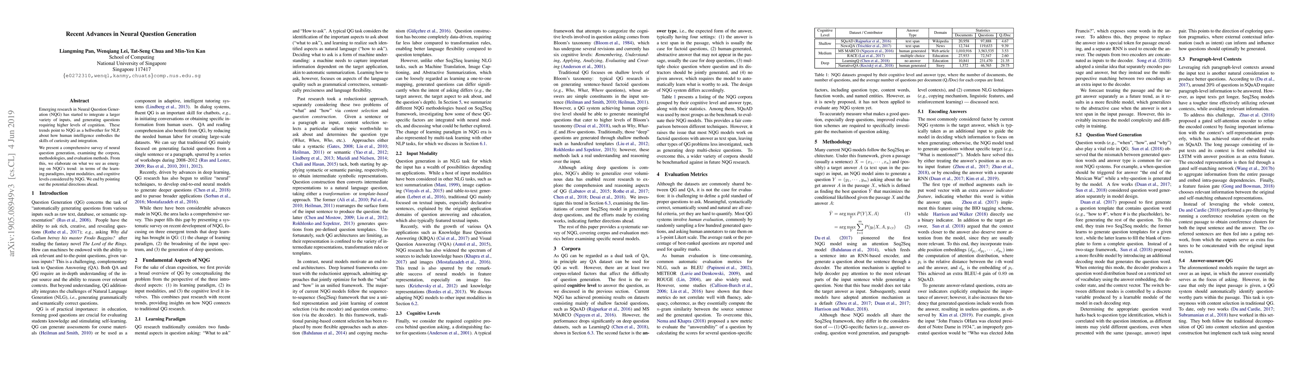 This paper provides a comprehensive survey of recent advances in Neural Question Generation (NQG), highlighting trends in diverse inputs, higher cognitive levels, and emerging methodologies. It discusses potential future directions for NQG in NLP, emphasizing its role in understanding human intelligence.