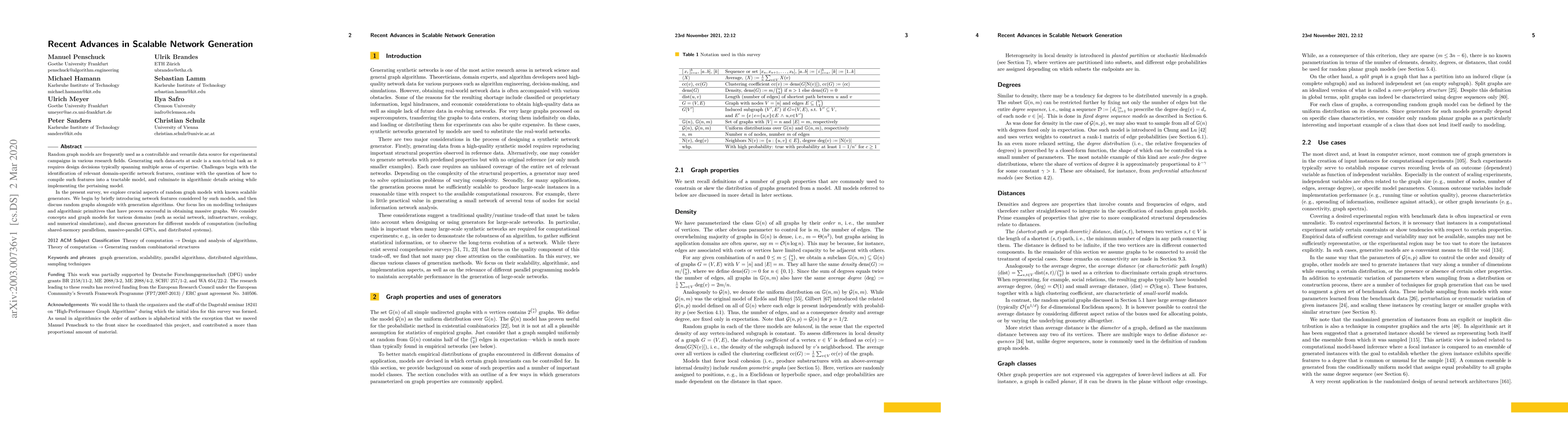Random graph models are frequently used as a controllable and versatile data source for experimental campaigns in various research fields. Generating such data-sets at scale is a non-trivial task as it requires design decisions typically spanning multiple areas of expertise. Challenges begin with the identification of relevant domain-specific network features, continue with the question of how to compile such features into a tractable model, and culminate in algorithmic details arising while implementing the pertaining model. In the present survey, we explore crucial aspects of random graph models with known scalable generators. We begin by briefly introducing network features considered by such models, and then discuss random graphs alongside with generation algorithms. Our focus lies on modelling techniques and algorithmic primitives that have proven successful in obtaining massive graphs. We consider concepts and graph models for various domains (such as social network, infrastructure, ecology, and numerical simulations), and discuss generators for different models of computation (including shared-memory parallelism, massive-parallel GPUs, and distributed systems).