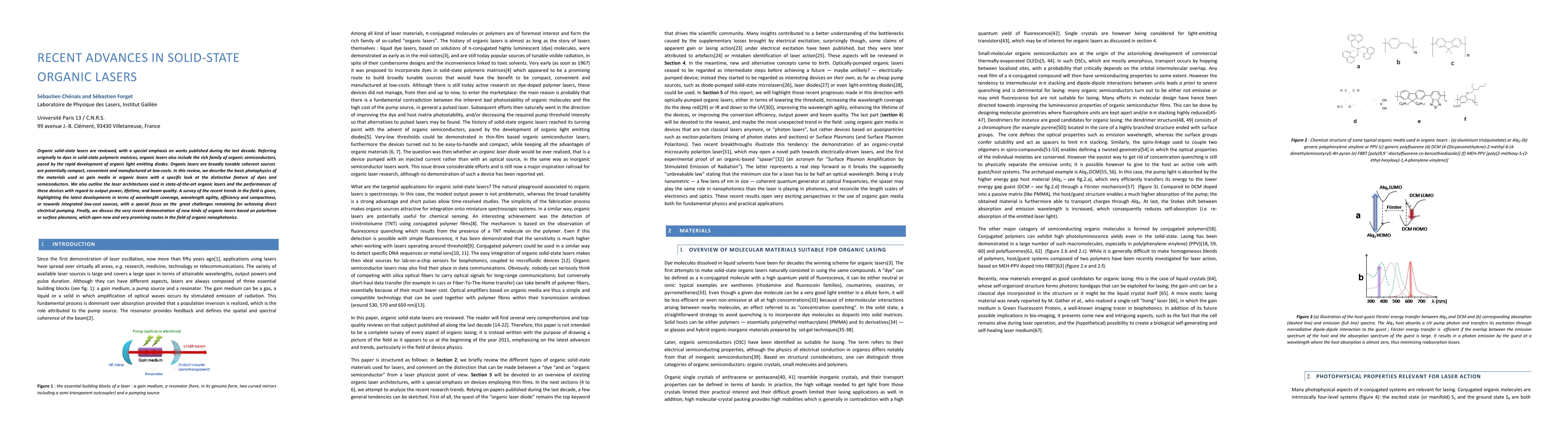 This review covers recent advancements in organic solid-state lasers, focusing on materials, architectures, and performance metrics over the past decade, while highlighting new developments in wavelength agility, efficiency, and compact, low-cost designs, and introducing novel laser types based on polaritons and surface plasmons.