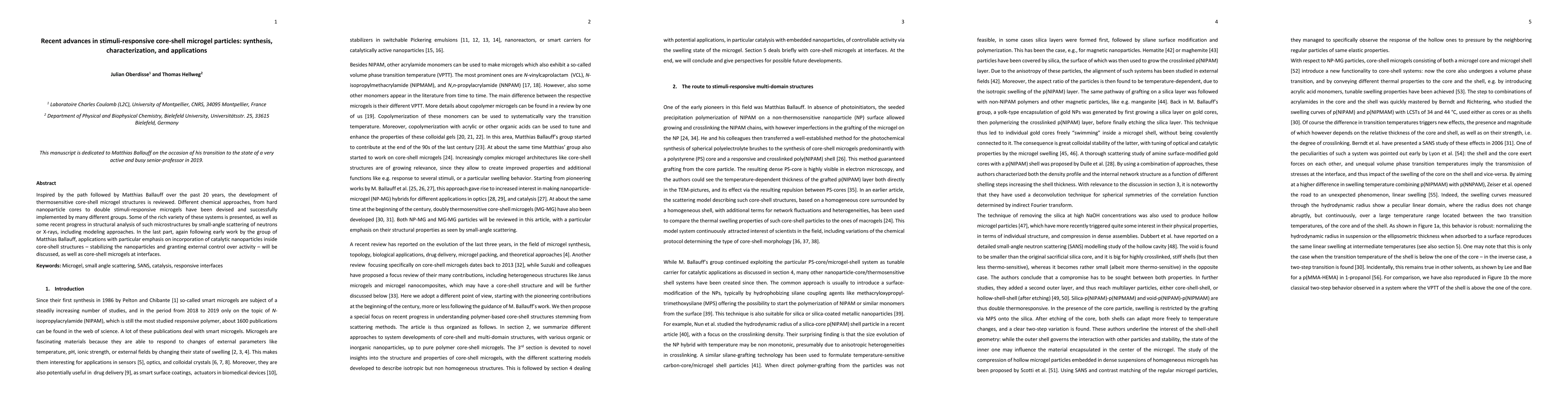 Inspired by the path followed by Matthias Ballauff over the past 20 years, the development of thermosensitive core-shell microgel structures is reviewed. Different chemical approaches, from hard nanoparticle cores to double stimuli-responsive microgels have been devised and successfully implemented by many different groups. Some of the rich variety of these systems is presented, as well as some recent progress in structural analysis of such microstructures by small-angle scattering of neutrons or X-rays, including modeling approaches. In the last part, again following early work by the group of Matthias Ballauff, applications with particular emphasis on incorporation of catalytic nanoparticles inside core-shell structures -- stabilizing the nanoparticles and granting external control over activity -- will be discussed, as well as core-shell microgels at interfaces.