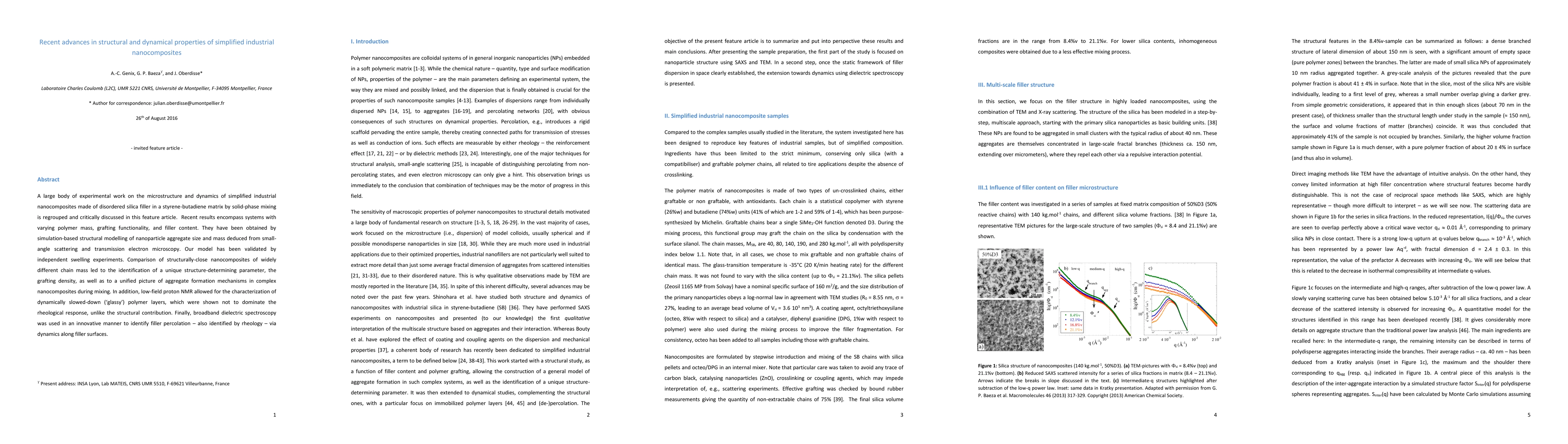 A large body of experimental work on the microstructure and dynamics of simplifiedindustrial nanocomposites made of disordered silica filler in a styrene-butadiene matrixby solid-phase mixing is regrouped and critically discussed in this feature article. Recentresults encompass systems with varying polymer mass, grafting functionality, and fillercontent. They have been obtained by simulation-based structural modelling of nanoparticleaggregate size and mass deduced from small-angle scattering and transmission electronmicroscopy. Our model has been validated by independent swelling experiments.Comparison of structurally-close nanocomposites of widely different chain mass led tothe identification of a unique structure-determining parameter, the grafting density, aswell as to a unified picture of aggregate formation mechanisms in complex nanocompositesduring mixing. In addition, low-field proton NMR allowed for the characterization ofdynamically slowed-down ('glassy') polymer layers, which were shown not to dominatethe rheological response, unlike the structural contribution. Finally, broadband dielectricspectroscopy was used in an innovative manner to identify filler percolation -- also identifiedby rheology -- via dynamics along filler surfaces.