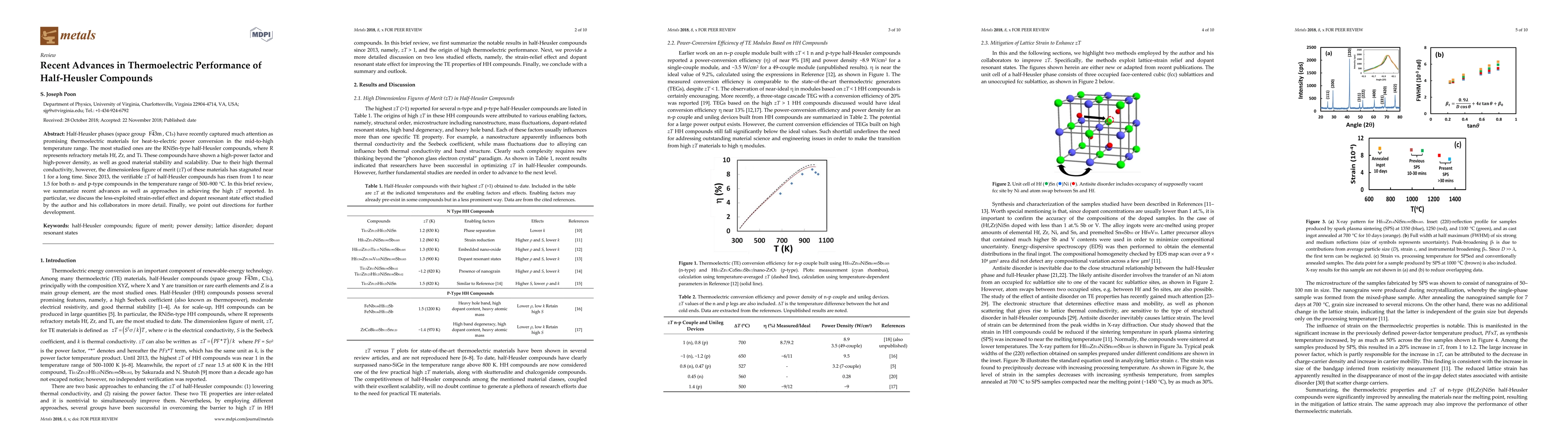 Half-Heusler phases (space group F43m, C1b) have recently captured much attention as promising thermoelectric materials for heat-to-electric power conversion in the mid-to-high temperature range. The most studied ones are the RNiSn-type half-Heusler compounds, where R represents refractory metals Hf, Zr, and Ti. These compounds have shown a high-power factor and high-power density, as well as good material stability and scalability. Due to their high thermal conductivity, however, the dimensionless figure of merit (zT) of these materials has stagnated near 1 for a long time. Since 2013, the verifiable ZT of half-Heusler compounds has risen from 1 to near 1.5 for both n- and p-type compounds in the temperature range of 500 to 900 degrees C. In this brief review, we summarize recent advances as well as approaches in achieving the high ZT reported. In particular, we discuss the less-exploited strain-relief effect and dopant resonant state effect studied by the author and his collaborators in more detail. Finally, we point out directions for further development. Keywords: half-Heusler compounds; figure of merit; power density; lattice disorder; dopant resonant states