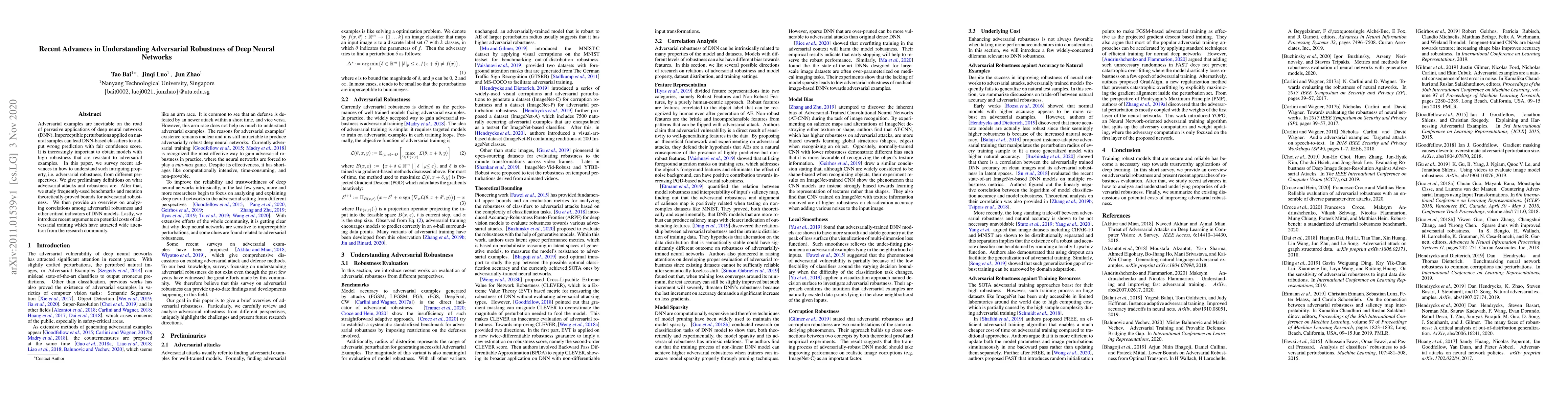 This paper surveys recent advances in understanding adversarial robustness of deep neural networks, defining adversarial attacks and robustness, and reviewing benchmarks and theoretical bounds. It also explores correlations between adversarial robustness and other DNN indicators, and discusses the potential costs of adversarial training.