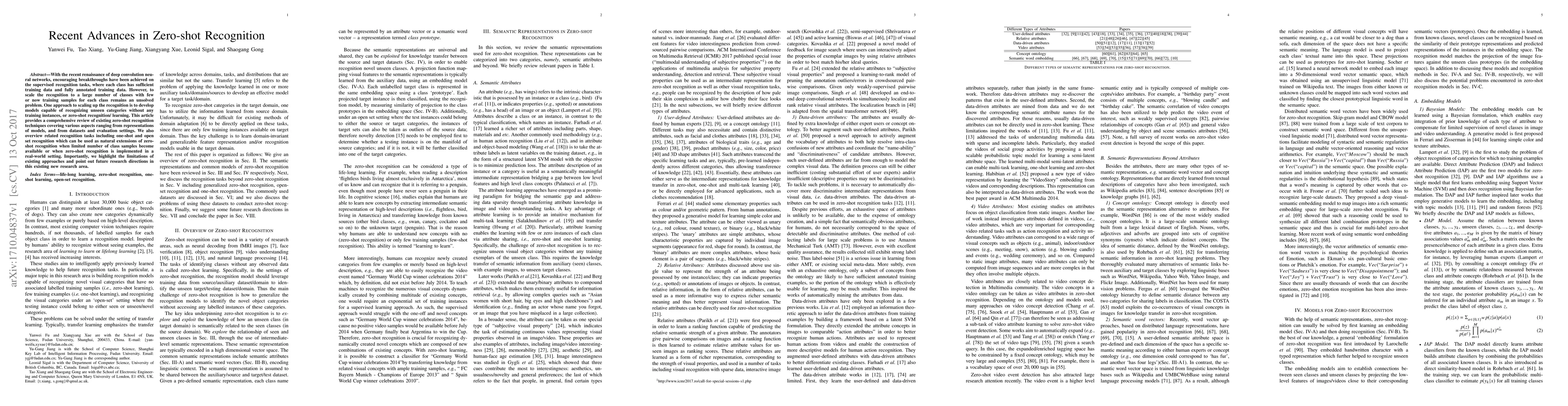 This paper reviews recent advancements in zero-shot recognition, highlighting techniques that enable the recognition of unseen classes without training instances. It also discusses related tasks like one-shot and open set recognition, and identifies limitations and future research directions in this emerging field.
