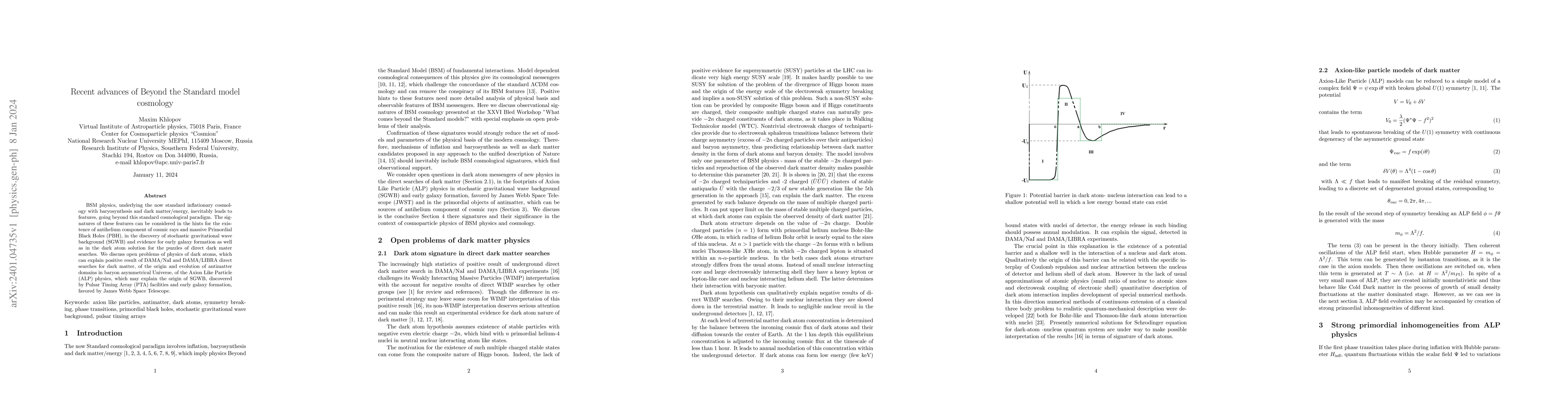 BSM physics, underlying the now standard inflationary cosmology with baryosynthesis and dark matter/energy, inevitably leads to features, going beyond this standard cosmological paradigm. The signatures of these features can be considered in the hints for the existence of antihelium component of cosmic rays and massive Primordial Black Holes (PBH), in the discovery of stochastic gravitational wave background (SGWB) and evidence for early galaxy formation as well as in the dark atom solution for the puzzles of direct dark mater searches. We discuss open problems of physics of dark atoms, which can explain positive result of DAMA/NaI and DAMA/LIBRA direct searches for dark matter, of the origin and evolution of antimatter domains in baryon asymmetrical Universe, of the Axion Like Particle (ALP) physics, which may explain the origin of SGWB, discovered by Pulsar Timing Array (PTA) facilities and early galaxy formation, favored by James Webb Space Telescope.