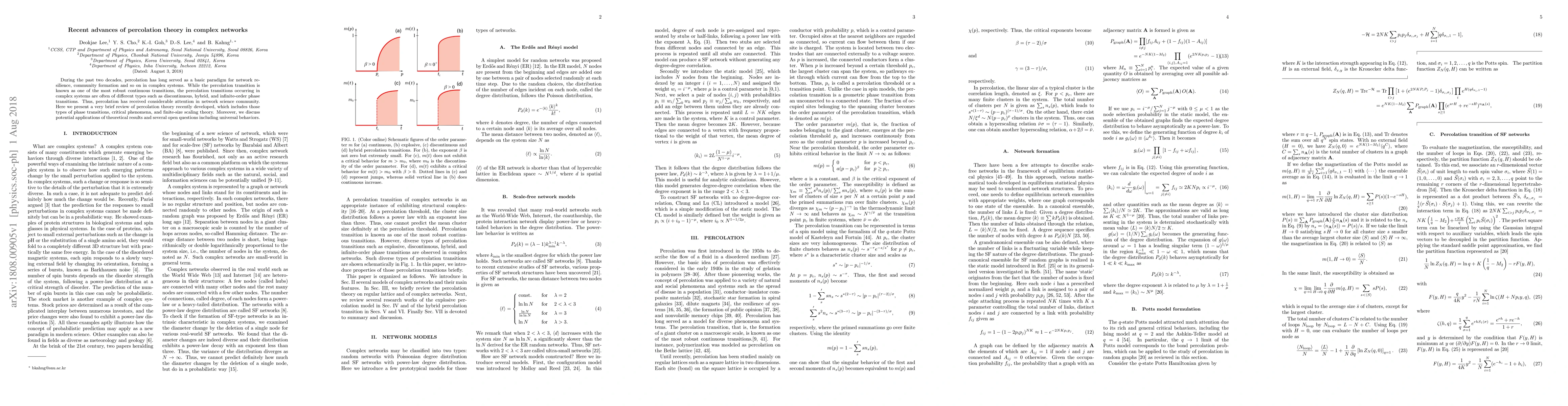 During the past two decades, percolation has long served as a basic paradigm for network resilience, community formation and so on in complex systems. While the percolation transition is known as one of the most robust continuous transitions, the percolation transitions occurring in complex systems are often of different types such as discontinuous, hybrid, and infinite-order phase transitions. Thus, percolation has received considerable attention in network science community. Here we present a very brief review of percolation theory recently developed, which includes those types of phase transitions, critical phenomena, and finite-size scaling theory. Moreover, we discuss potential applications of theoretical results and several open questions including universal behaviors.