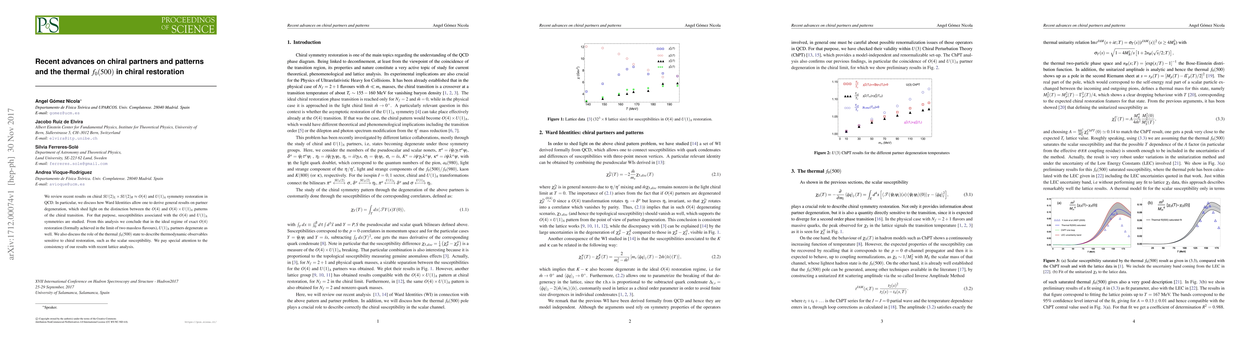 We review recent results on chiral $SU(2)_L\times SU(2)_R\approx O(4)$ and $U(1)_A$ symmetry restoration in QCD. In particular, we discuss how Ward Identities allow one to derive general results on partner degeneration, which shed light on the distinction between the $O(4)$ and $O(4)\times U(1)_A$ patterns of the chiral transition. For that purpose, susceptibilities associated with the $O(4)$ and $U(1)_A$ symmetries are studied. From this analysis we conclude that in the ideal regime of exact $O(4)$ restoration (formally achieved in the limit of two massless flavours), $U(1)_A$ partners degenerate as well. We also discuss the role of the thermal $f_0(500)$ state to describe thermodynamic observables sensitive to chiral restoration, such as the scalar susceptibility. We pay special attention to the consistency of our results with recent lattice analysis.