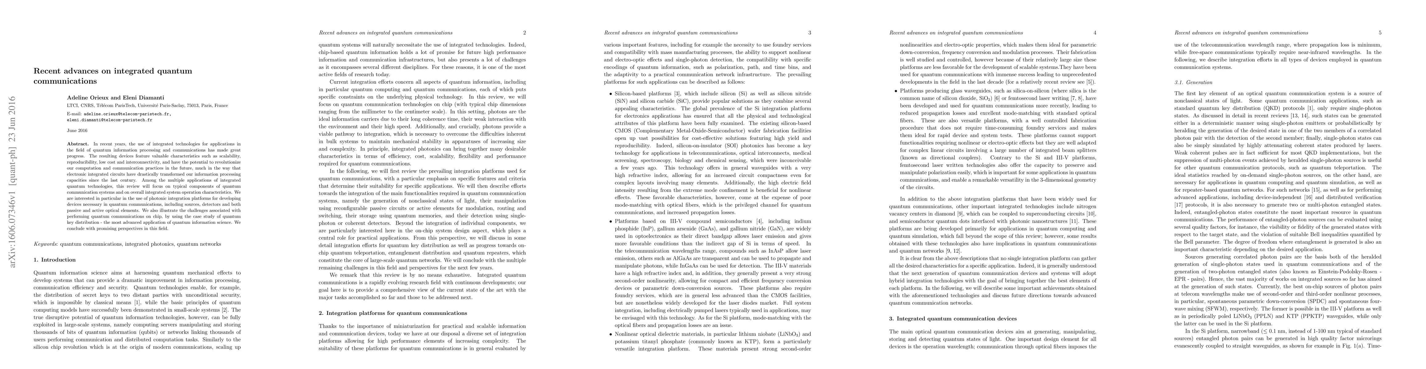 This paper reviews recent advancements in integrated quantum communication technologies, emphasizing scalable, cost-effective photonic platforms for quantum information processing. It highlights challenges in quantum key distribution on chip and outlines promising future prospects.