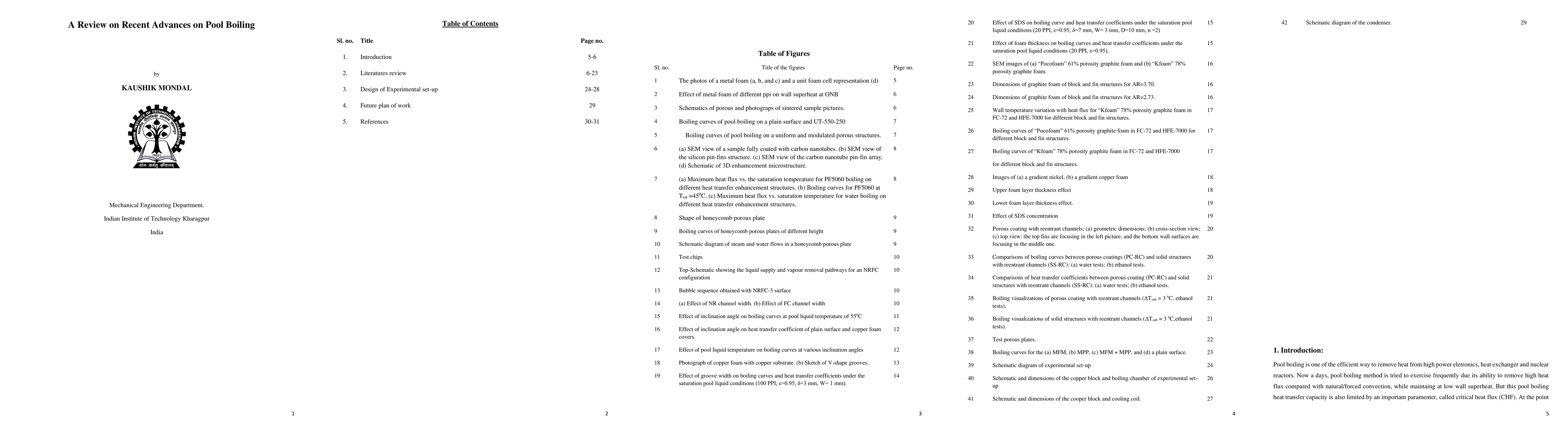 Pool boiling is one of the efficient ways to remove heat from high-power electronics, heat exchangers, and nuclear reactors. Nowadays, the pool boiling method is tried to exercise frequently due to its ability to remove high heat flux compared with natural/forced convection, while maintaining at low wall superheat. But this pool boiling heat transfer capacity is also limited by an important parameter, called critical heat flux (CHF). At the point of CHF, the heat transfer coefficient (HTC) drastically decreases due to the change of the heat transfer regime from nucleate boiling to film boiling. This is why, the enhancement of CHF, while maintaining low wall superheat is of great interest to engineers and researchers.