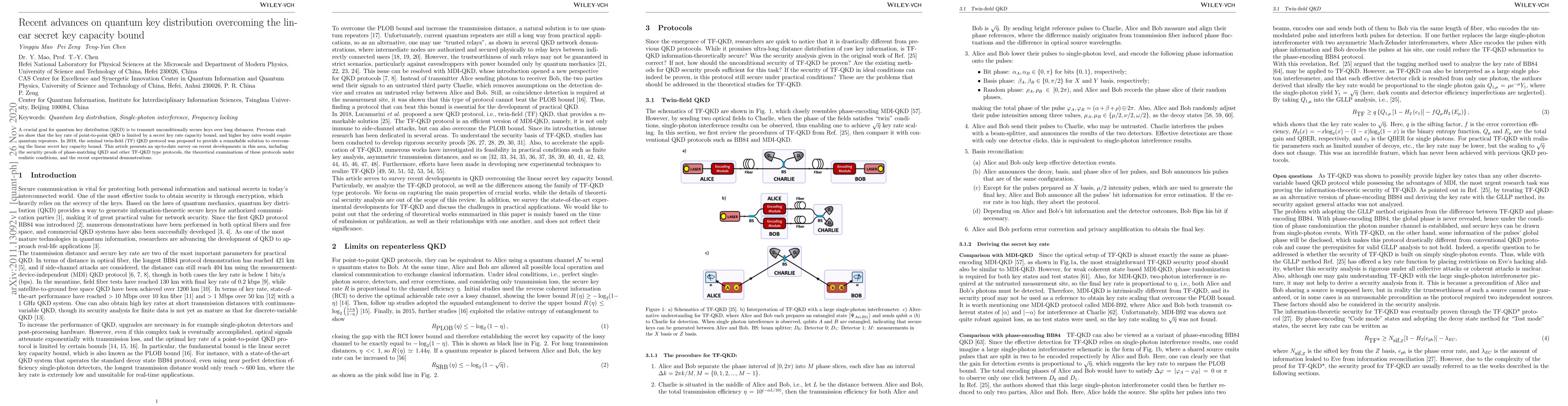 This paper surveys recent advancements in quantum key distribution (QKD) that surpass the linear secret key capacity bound, focusing on the twin-field QKD protocol introduced in 2018, along with its security proofs and experimental implementations. It also covers theoretical analyses of these protocols under realistic conditions.