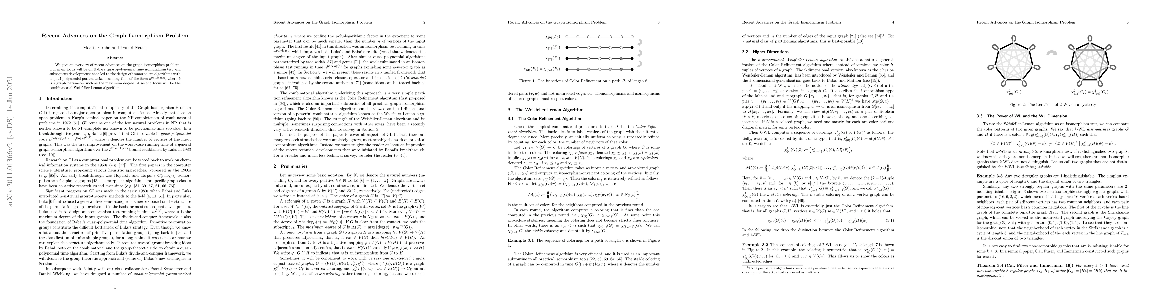 The research provides an overview of recent advances in the graph isomorphism problem, focusing on Babai's quasi-polynomial time isomorphism test and developments leading to algorithms with a quasi-polynomial parameterized running time of the form $n^{\text{polylog}(k)}$, where $k$ is a graph parameter like maximum degree. It also discusses the combinatorial Weisfeiler-Leman algorithm.