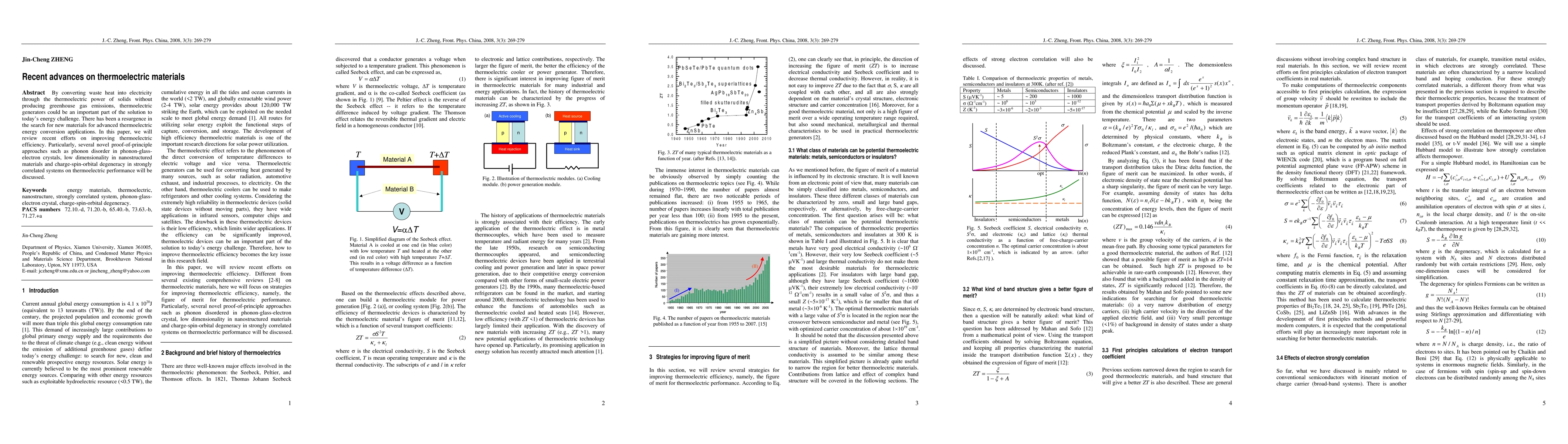 By converting waste heat into electricity through the thermoelectric power of solids without producing greenhouse gas emissions, thermoelectric generators could be an important part of the solution to today's energy challenge. There has been a resurgence in the search for new materials for advanced thermoelectric energy conversion applications. In this paper, we will review recent efforts on improving thermoelectric efficiency. Particularly, several novel proof-of-principle approaches such as phonon disorder in phonon-glasselectron crystals, low dimensionality in nanostructured materials and charge-spin-orbital degeneracy in strongly correlated systems on thermoelectric performance will be discussed.