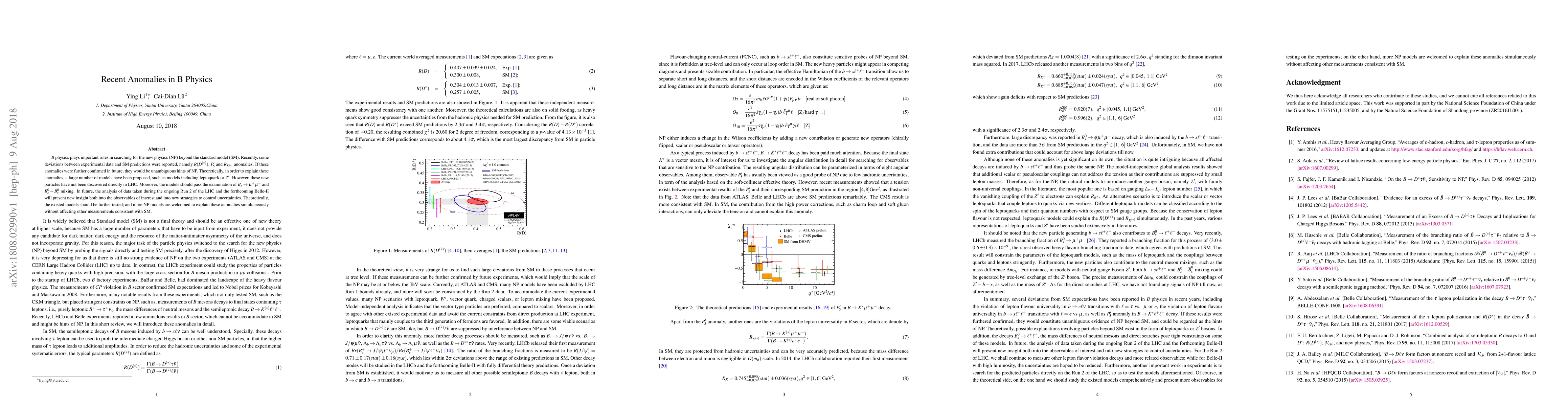 $B$ physics plays important roles in searching for the new physics (NP) beyond the standard model (SM). Recently, some deviations between experimental data and SM predictions were reported, namely $R(D^{(*)})$, $P_5^\prime$ and $R_{K^{(*)}}$ anomalies. If these anomalies were further confirmed in future, they would be unambiguous hints of NP. Theoretically, in order to explain these anomalies, a large number of models have been proposed, such as models including leptoquark or $Z^\prime$. However, these new particles have not been discovered directly in LHC. Moreover, the models should pass the examination of $B_s\to \mu^+\mu^-$ and $B_s^0-\bar B_s^0$ mixing. In future, the analysis of data taken during the ongoing Run 2 of the LHC and the forthcoming Belle-II will present new insight both into the observables of interest and into new strategies to control uncertainties. Theoretically, the existed models should be further tested; and more NP models are welcomed to explain these anomalies simultaneously without affecting other measurements consistent with SM.