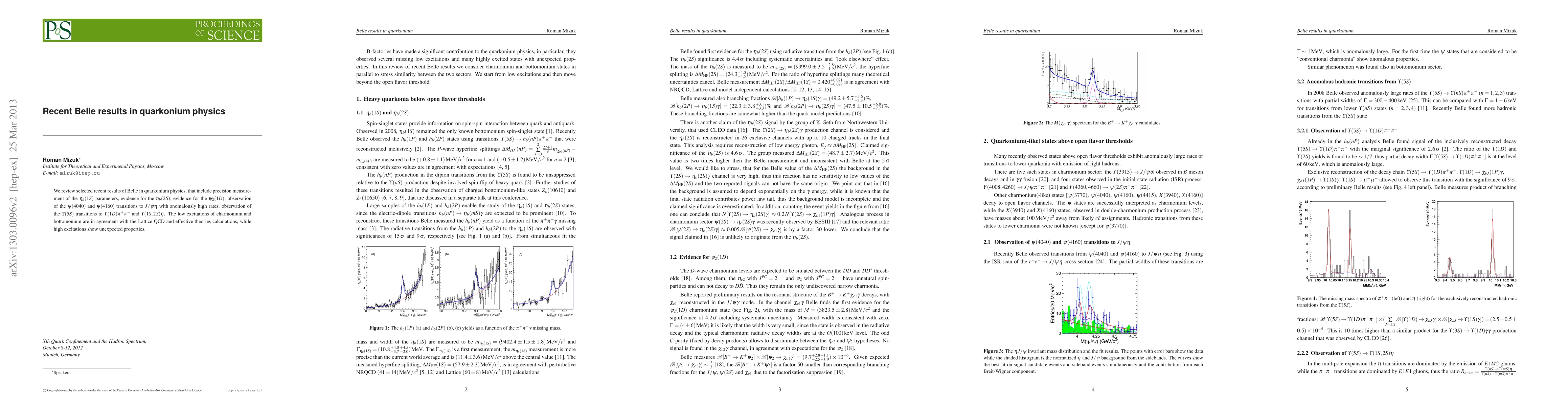 Summary: The Belle collaboration reports precision measurements and observations in quarkonium physics, including new evidence for eta_b(2S) and psi_2(1D), and transitions with anomalously high rates. Low excitation states align with theoretical predictions, while high excitations reveal unexpected properties.