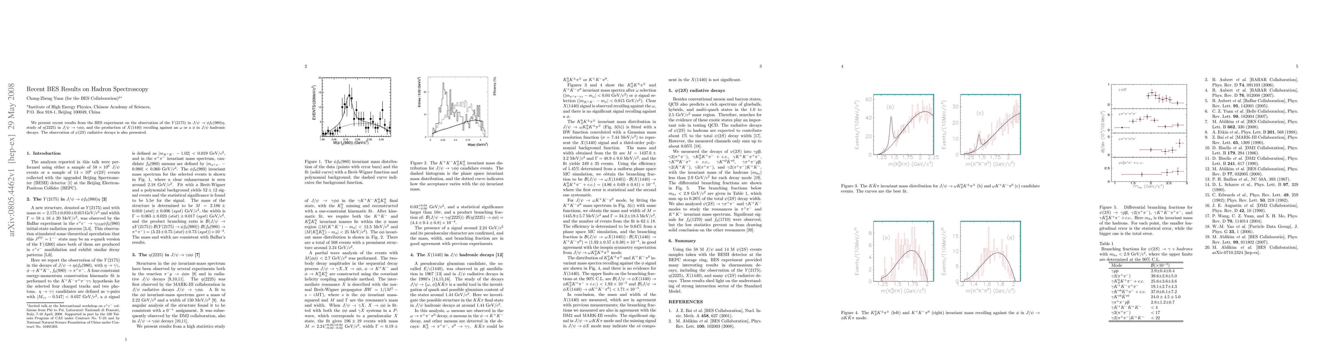 The BES experiment reports the observation of the Y(2175) particle in J/\psi decays, the study of \eta(2225) in J/\psi\to \gamma \phi \phi, and the production of X(1440) in J/\psi hadronic decays, alongside the observation of \psi(2S) radiative decays.