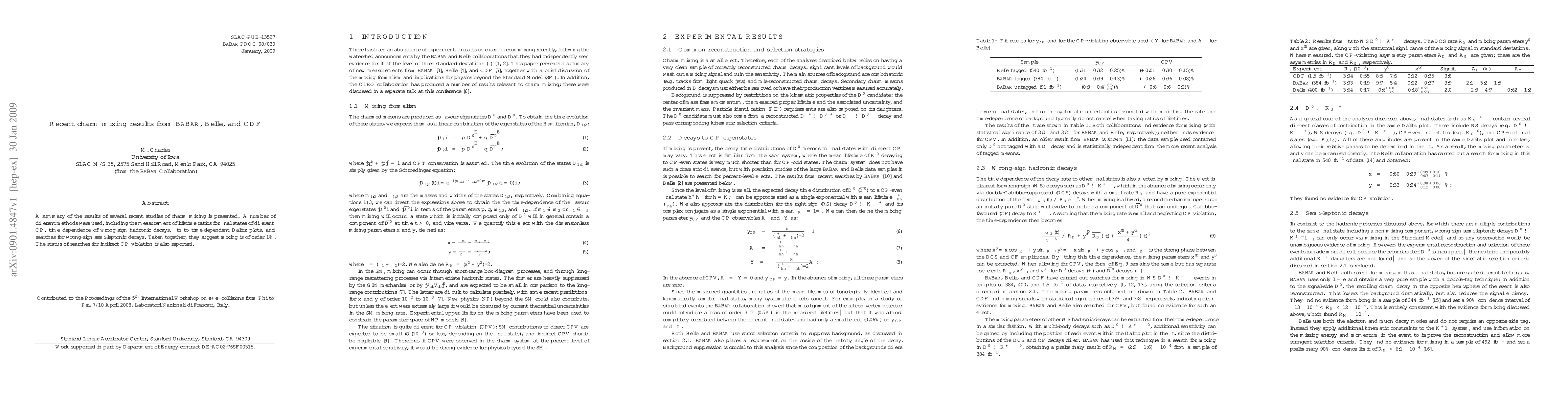 The paper provides a comprehensive summary of recent experimental results on charm mixing from BABAR, Belle, and CDF collaborations, employing various analytical methods to extract mixing parameters and test SM predictions.