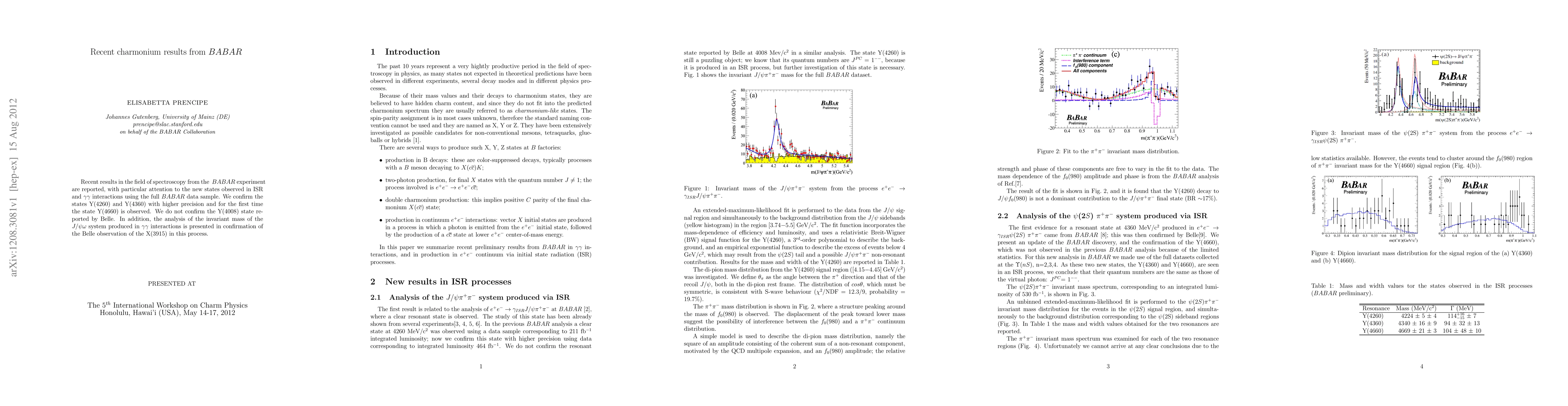 The BABAR experiment reports new charmonium states, confirming Y(4260) and Y(4360) with higher precision and observing Y(4660) for the first time. The Y(4008) state reported by Belle is not confirmed, and the X(3915) state is confirmed in the $J/\psi \omega$ system from $\gamma \gamma$ interactions.