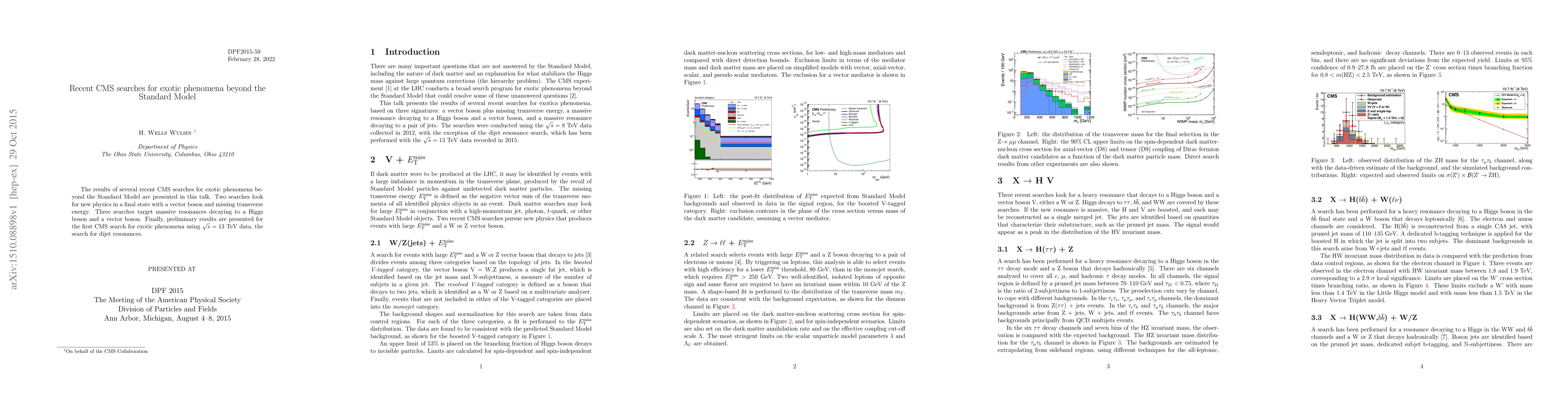 This paper summarizes recent CMS searches for exotic phenomena beyond the Standard Model, focusing on new physics in final states with vector bosons and missing transverse energy, massive resonances decaying to a Higgs boson and a vector boson, and preliminary results from a search for dijet resonances using 13 TeV data.