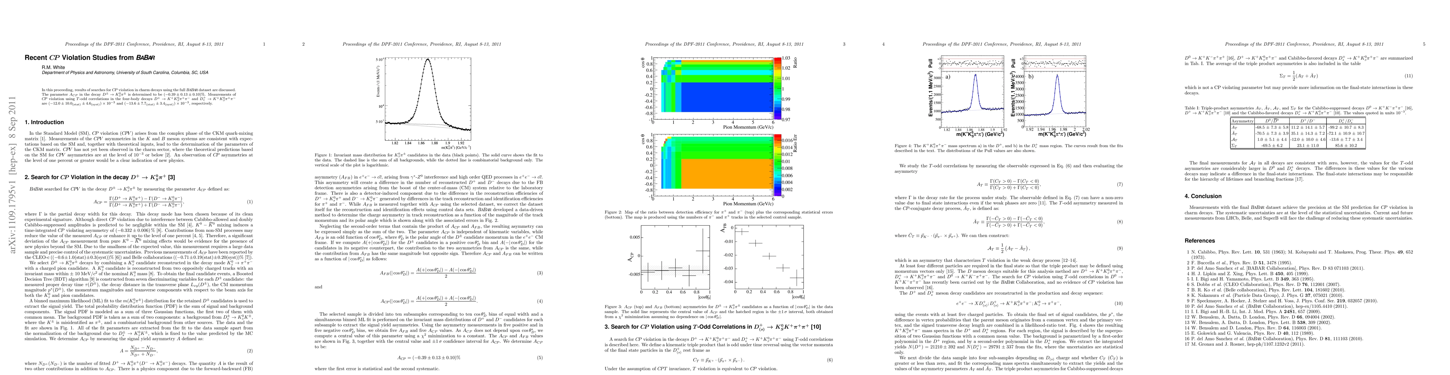 In this proceeding, results of searches for CP violation in charm decays using the full BABAR dataset are discussed. The parameter $A_{CP}$ in the decay $D^\pm\to\KS\pi^\pm$ is determined to be $(-0.39 \pm 0.13 \pm 0.10)%$. Meaurements of CP violation using \T-odd correlations in the four-body decays D^+->K^+K_S^0\pi^+\pi^- and D^+_s->K^+K_S^0\pi^+\pi^- are $(-12.0 \pm 10.0_{\stat} \pm 4.6_{\syst}) \times 10^{-3}$ and $(-13.6 \pm 7.7_{\stat} \pm 3.4_{\syst}) \times10^{-3}$, respectively.